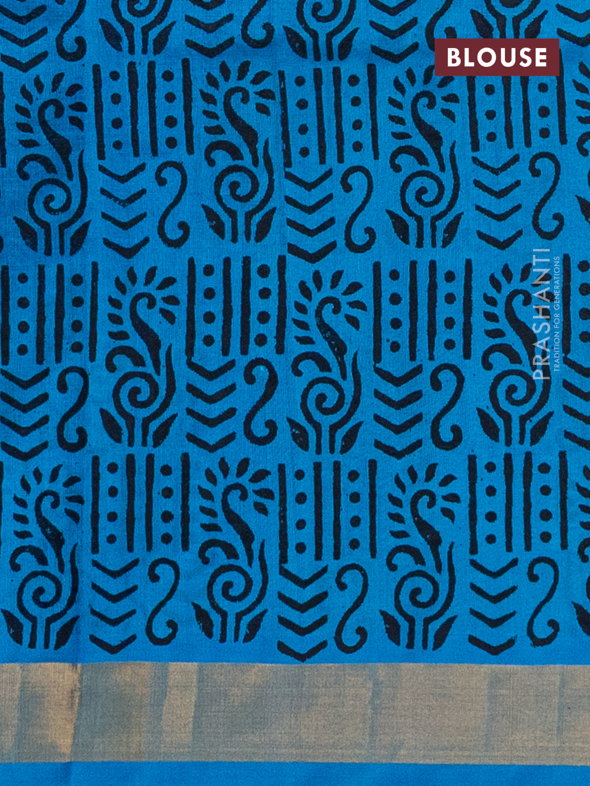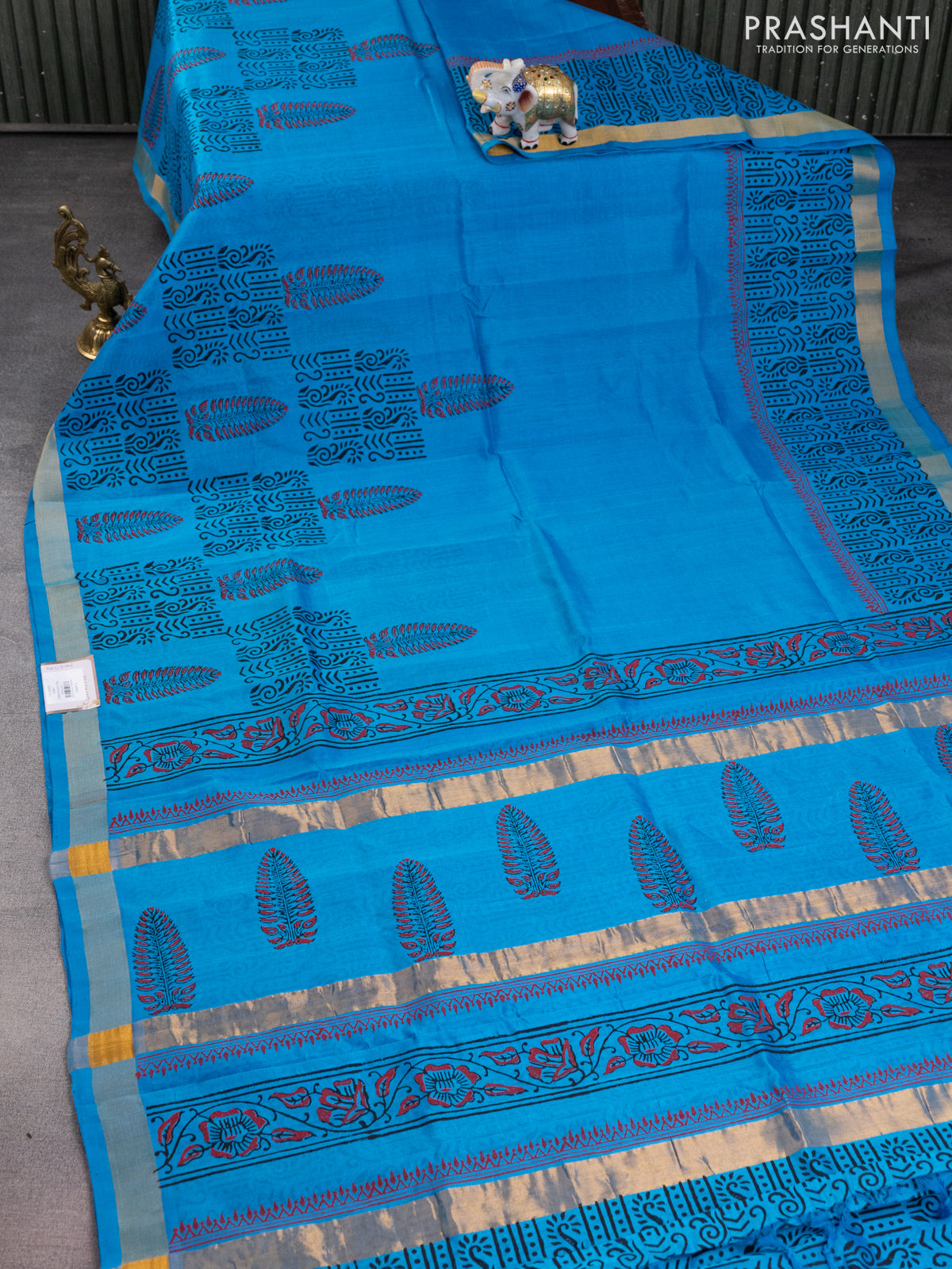 Silk cotton block printed saree light blue with allover prints and zari woven border