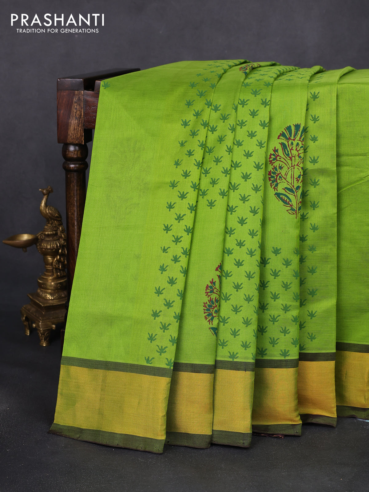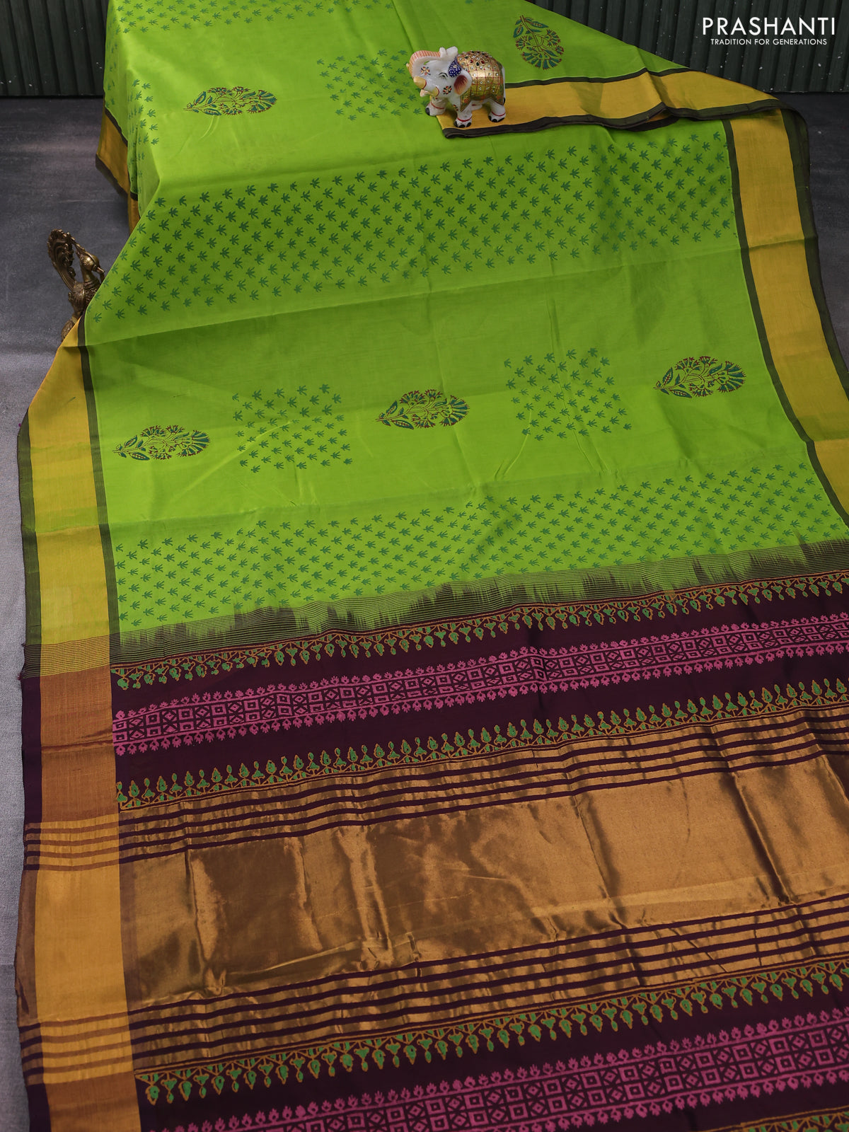 Silk cotton block printed saree light green and deep wine shade with floral butta prints and zari woven border