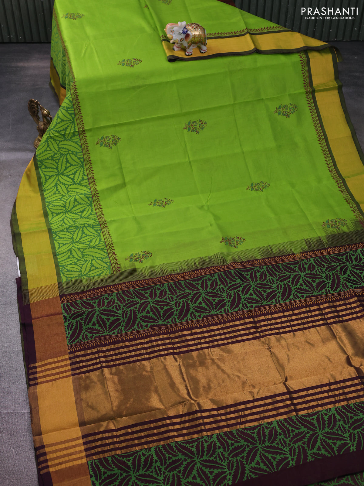 Silk cotton block printed saree light green and wine shade with butta prints and zari woven border