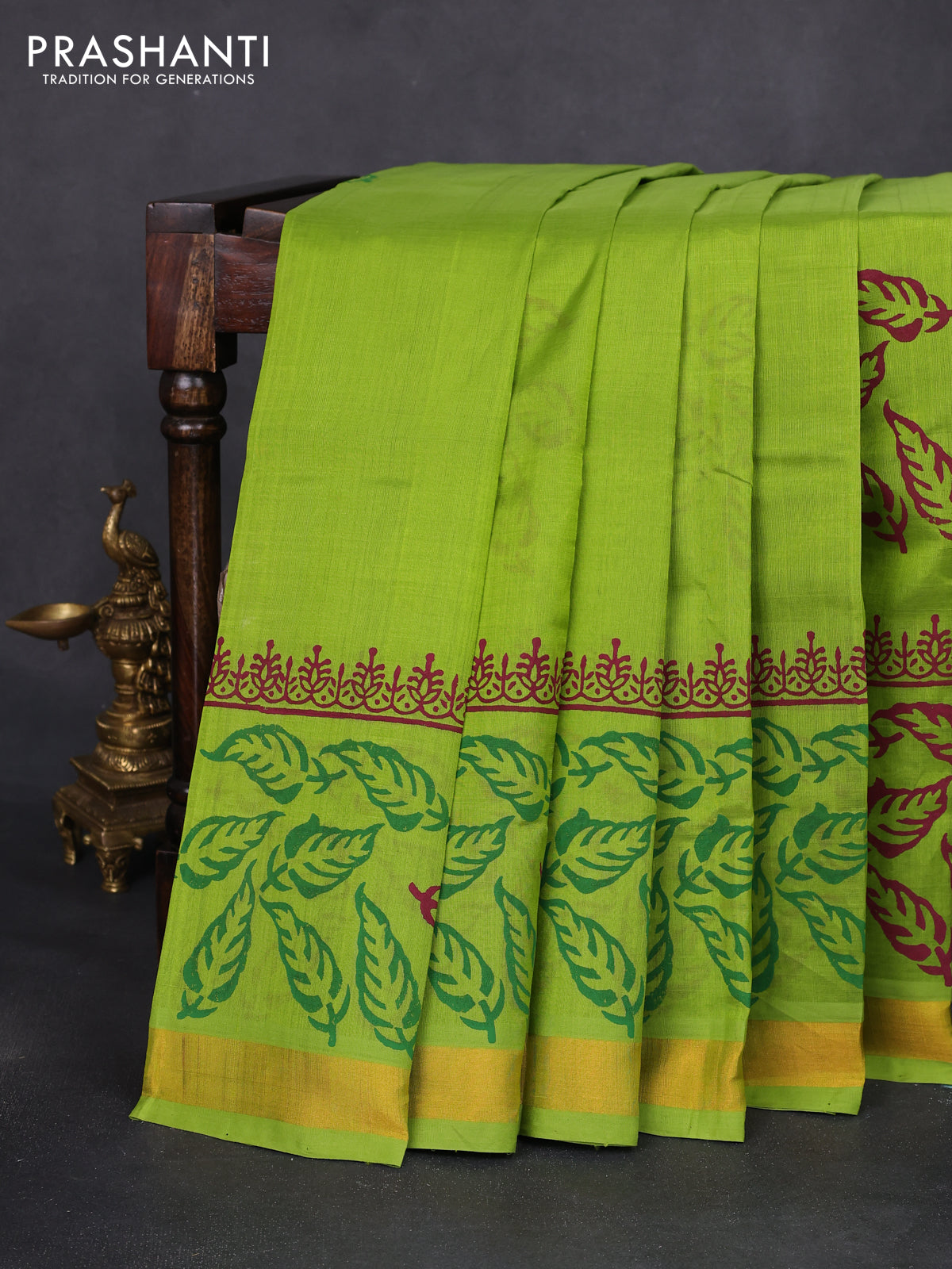 Silk cotton block printed saree light green with leaf prints and zari woven border