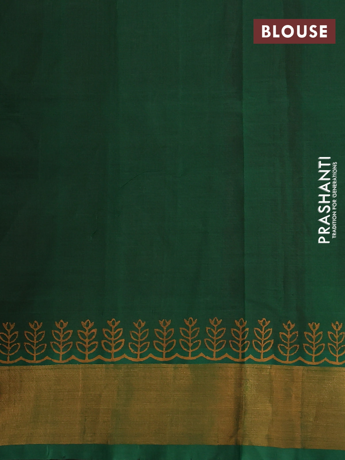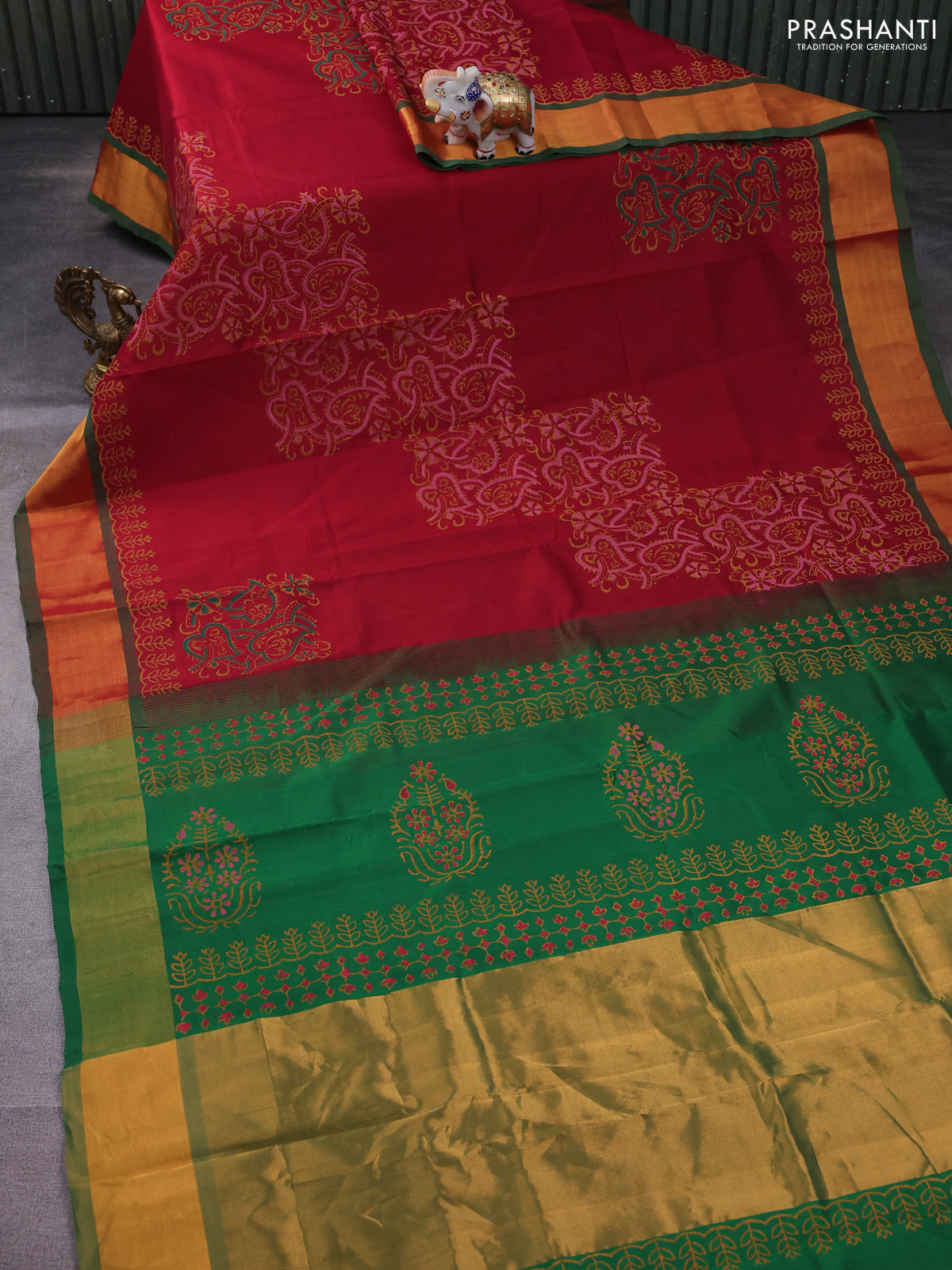 Silk cotton block printed saree maroon and green with allover prints and zari woven border