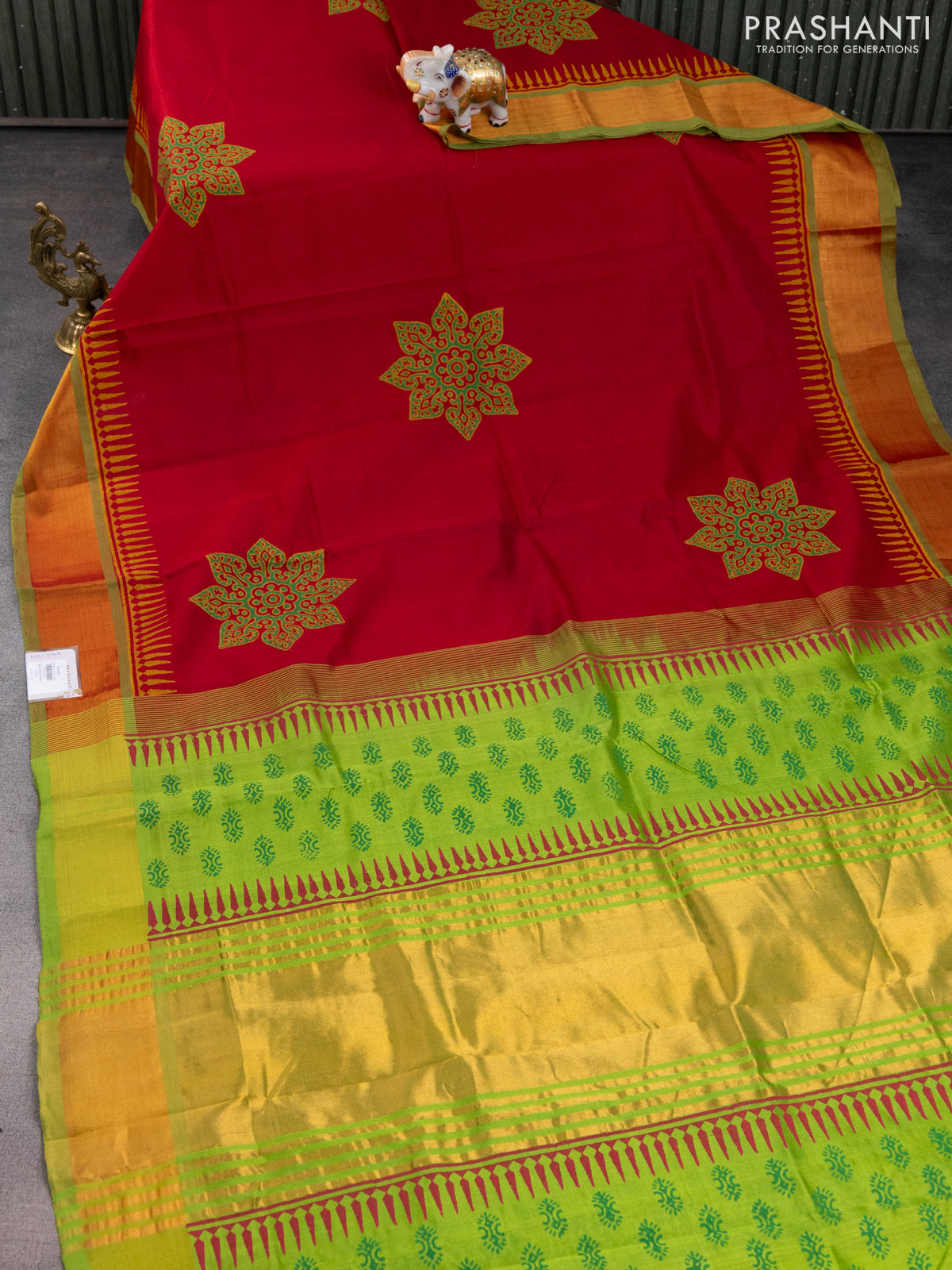 Silk cotton block printed saree maroon and light green with butta prints and zari woven border