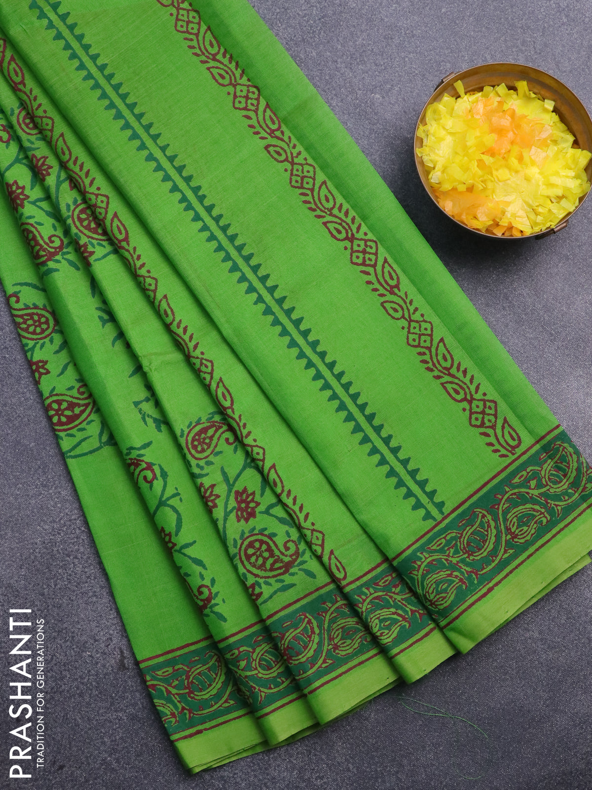 Silk cotton block printed saree parrot green with allover box type butta prints and printed border