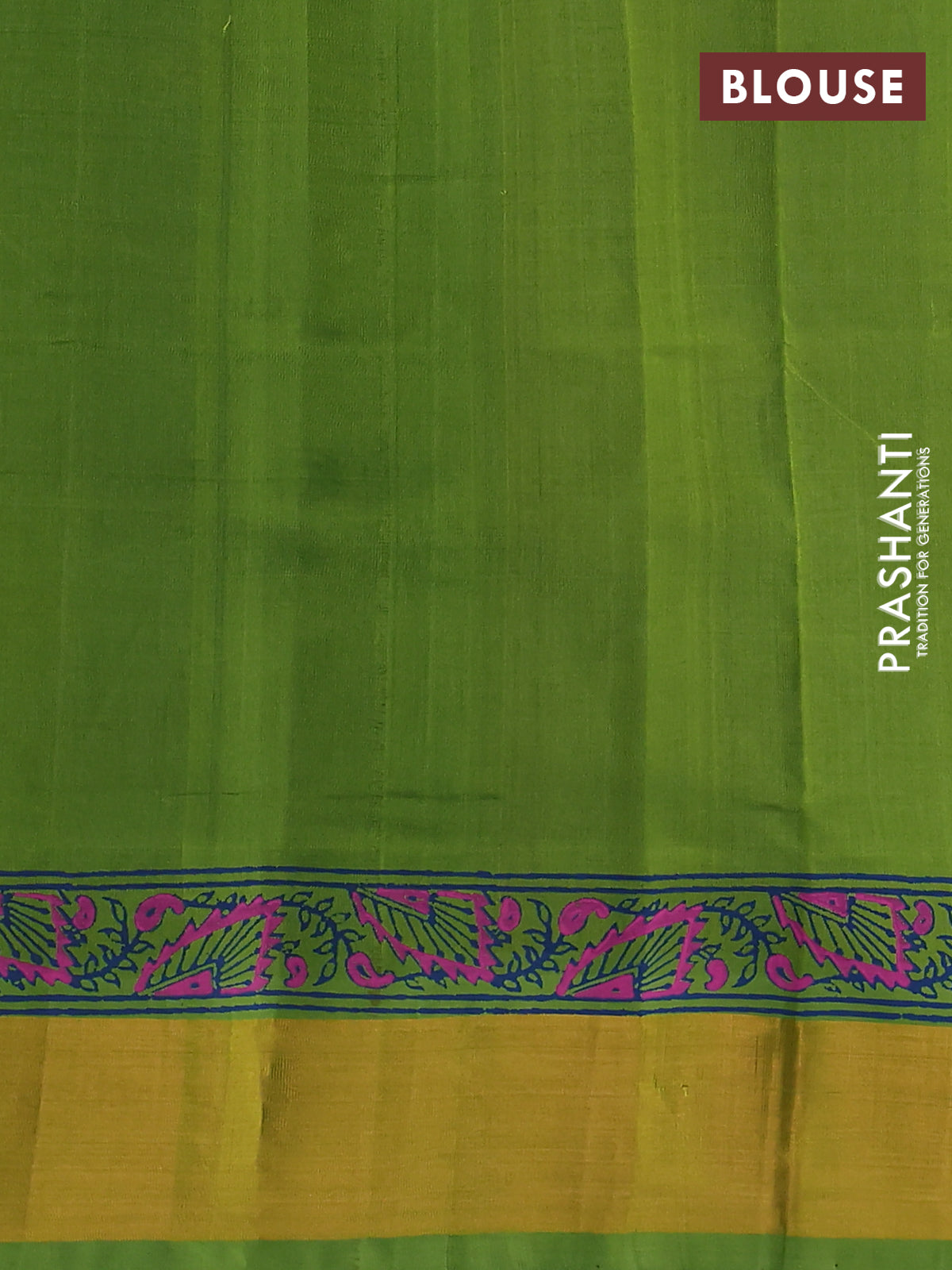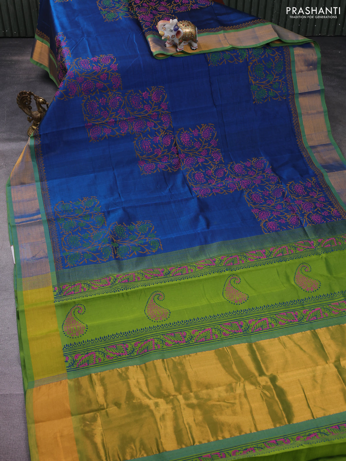 Silk cotton block printed saree peacock blue and light green with allover prints and zari woven border