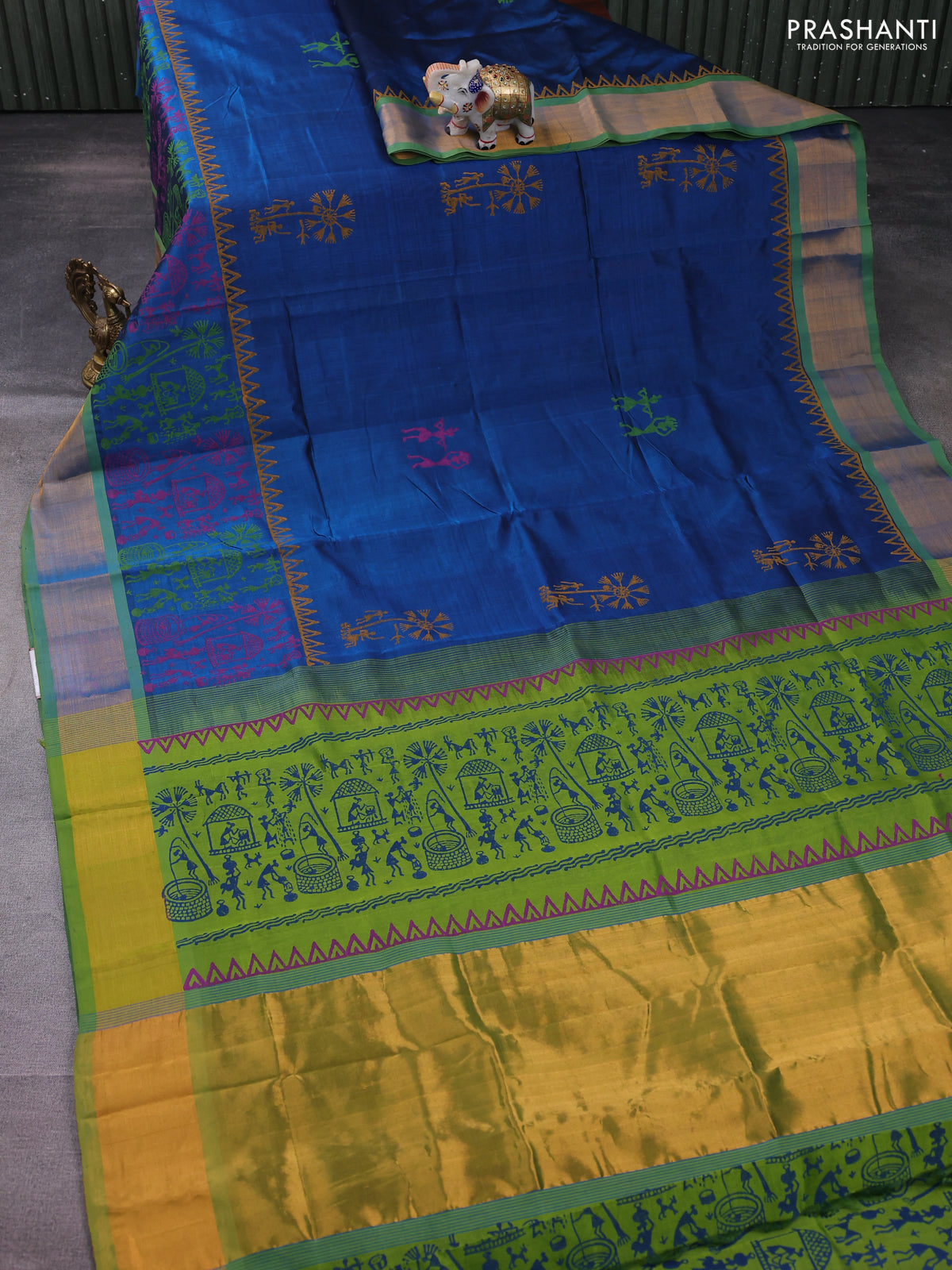 Silk cotton block printed saree peacock blue and light green with allover prints and zari woven border
