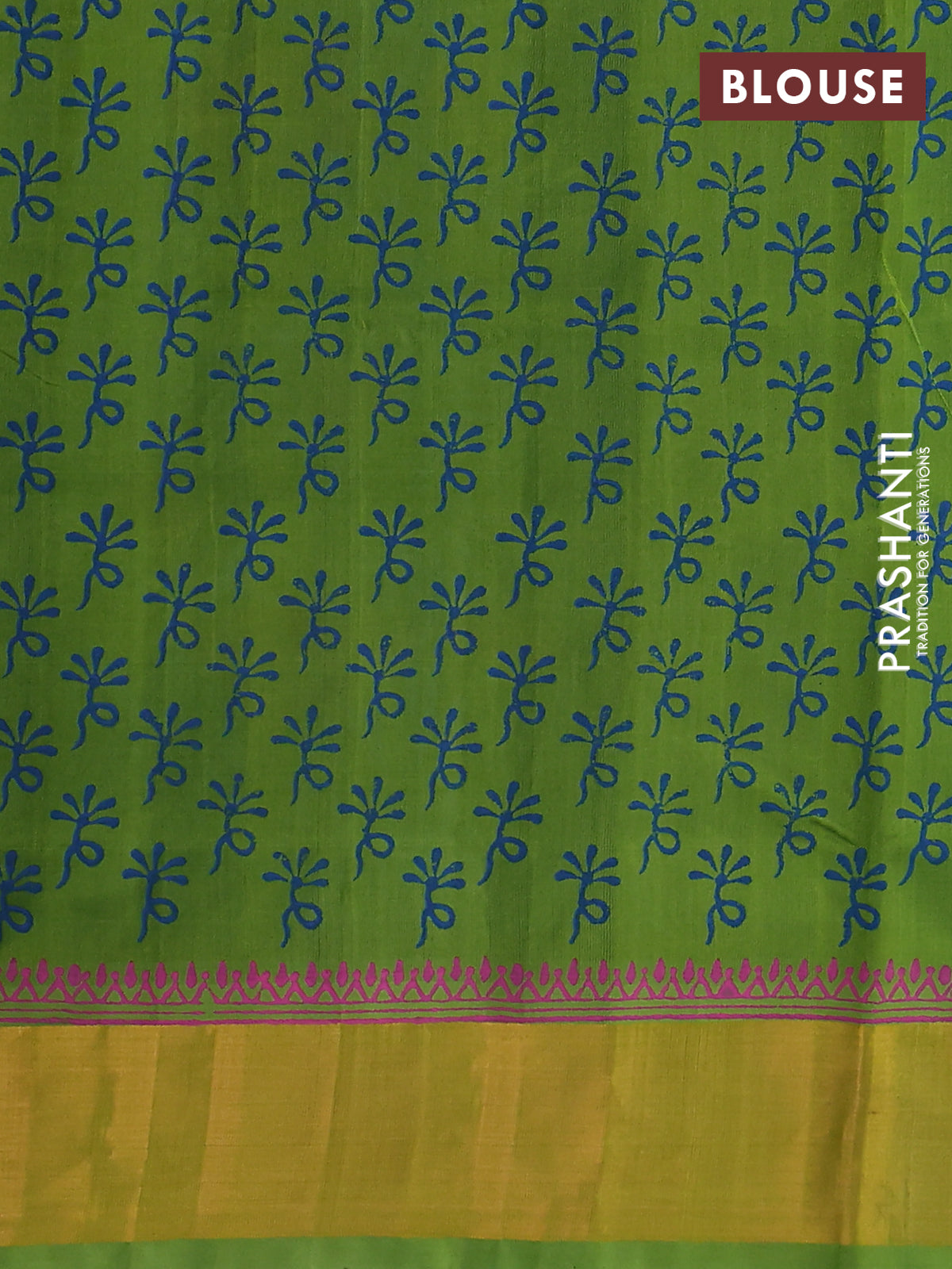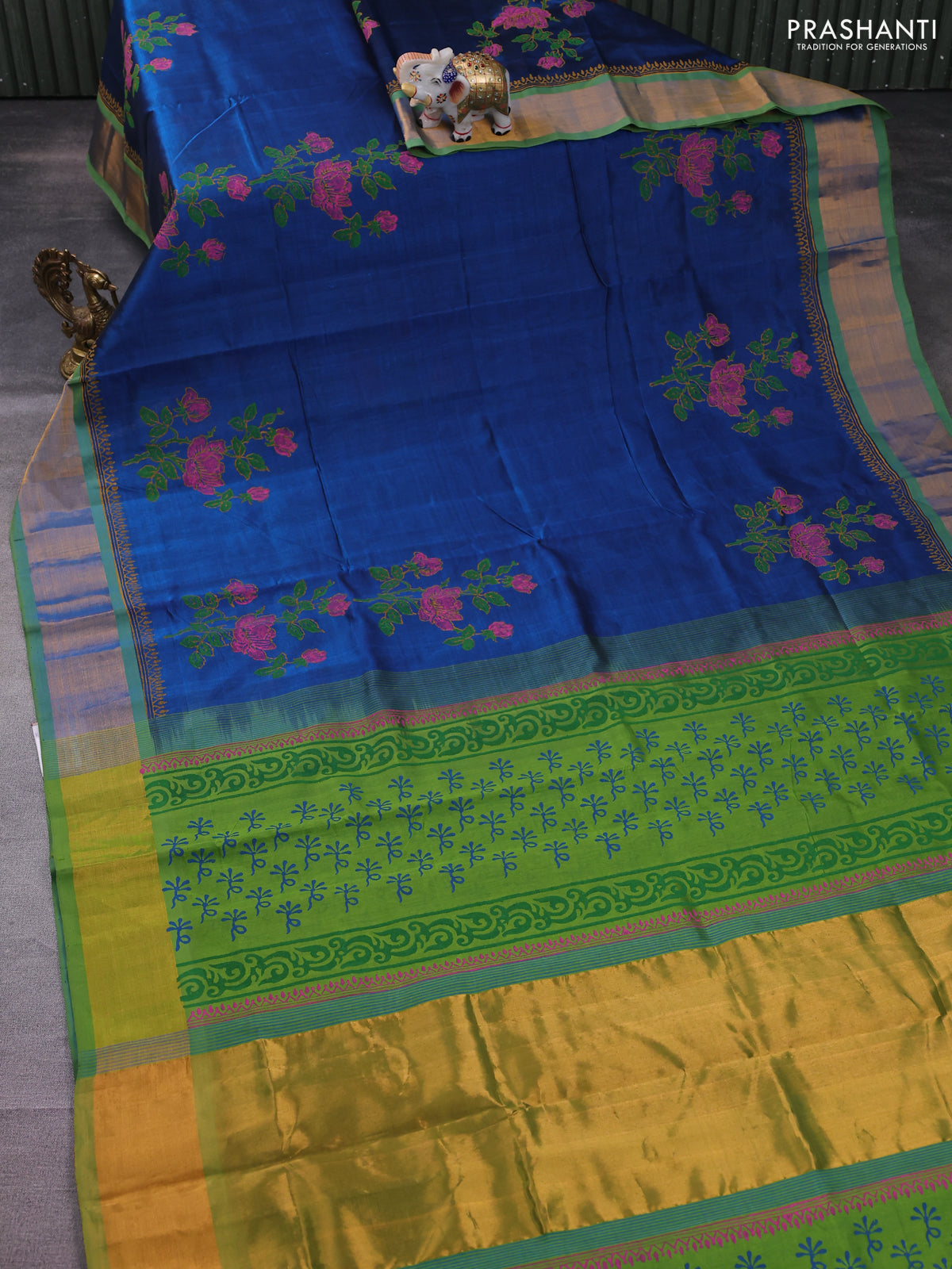 Silk cotton block printed saree peacock blue and light green with floral prints and zari woven border
