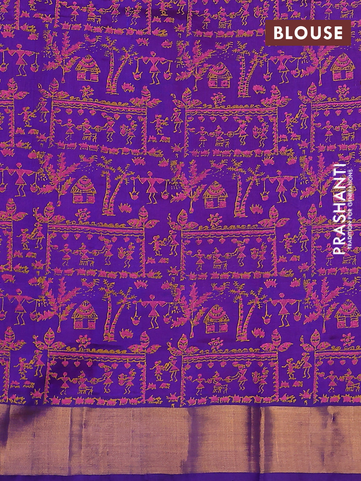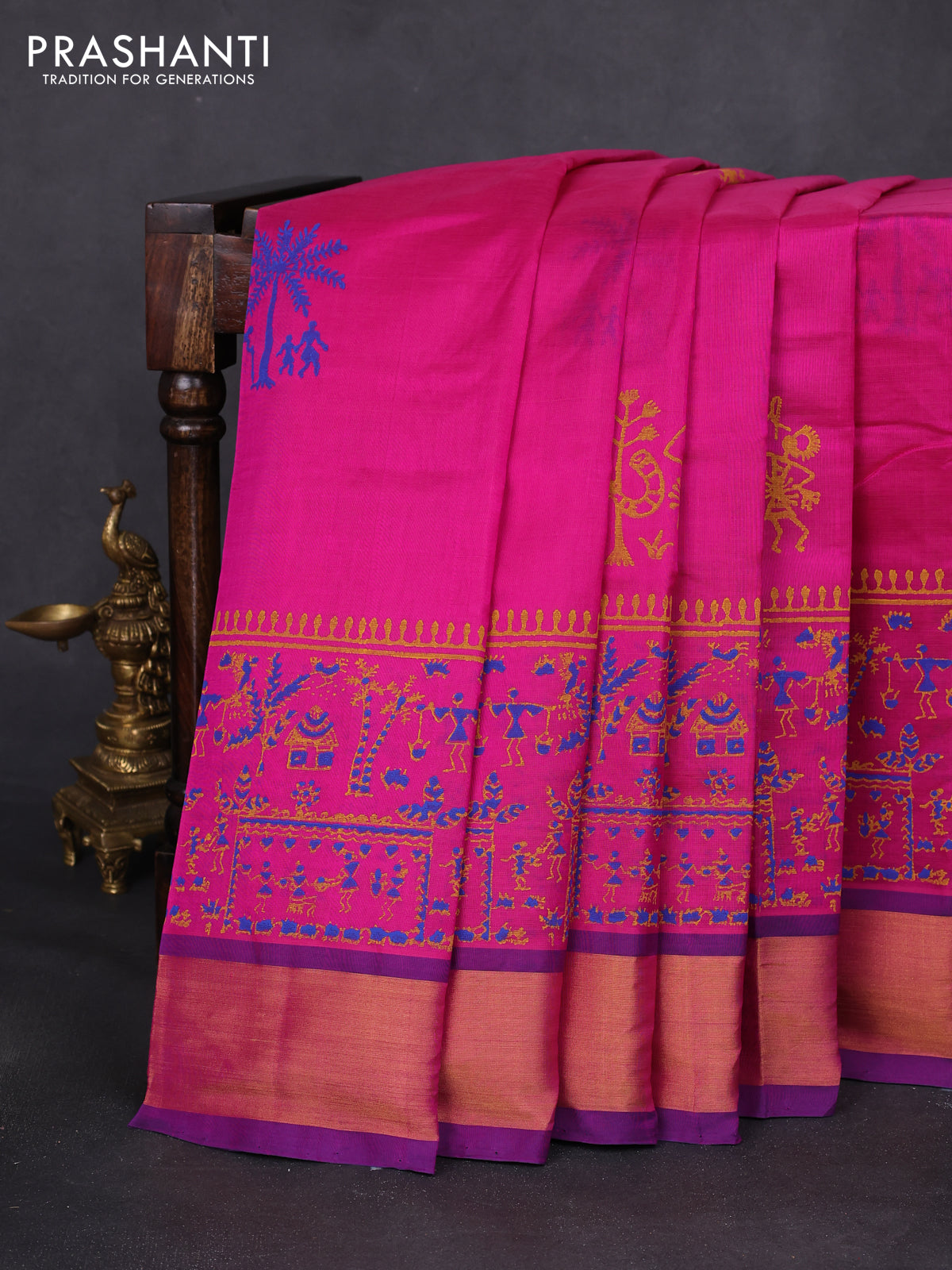 Silk cotton block printed saree pink and blue with warli prints and zari woven border
