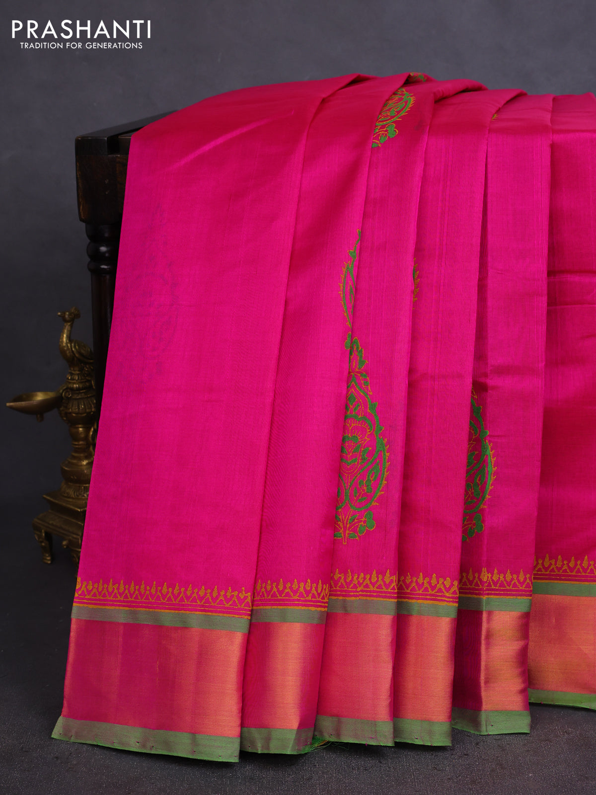 Silk cotton block printed saree pink and light green with butta prints and zari woven border