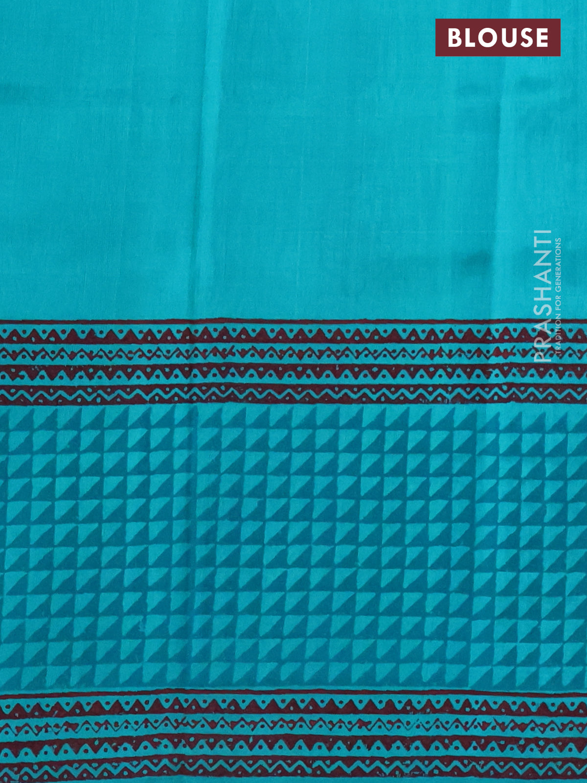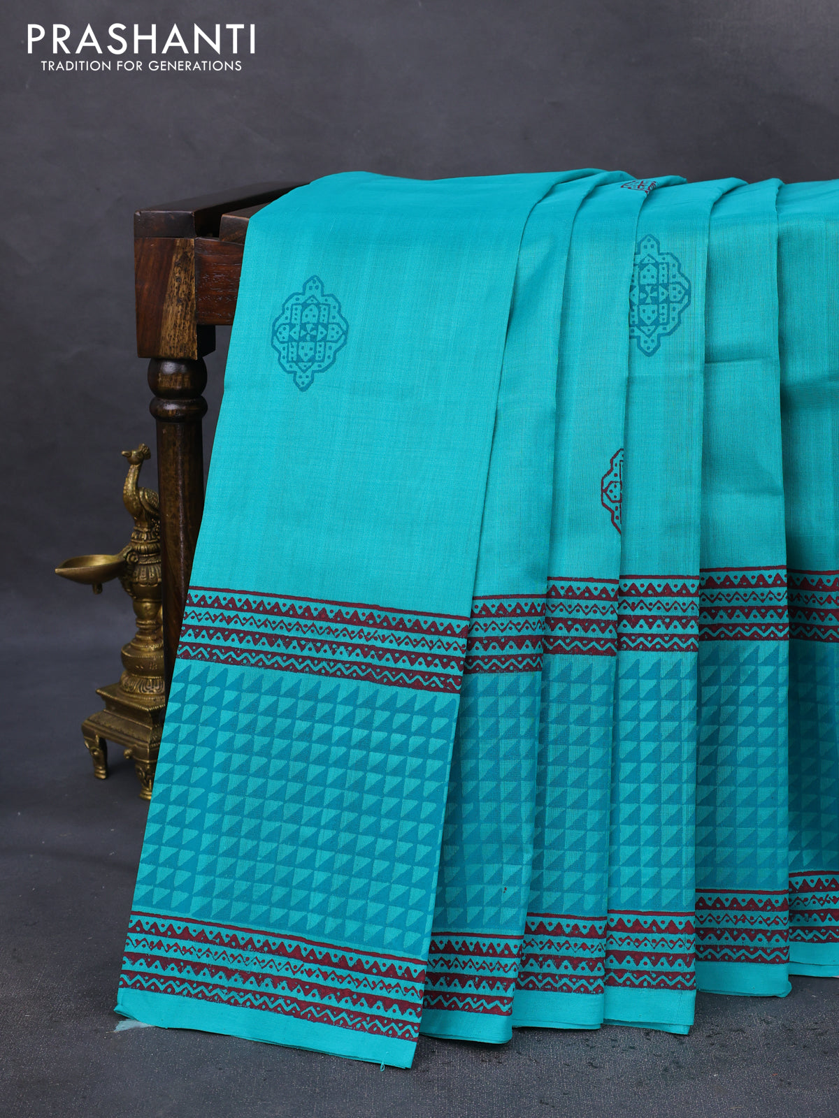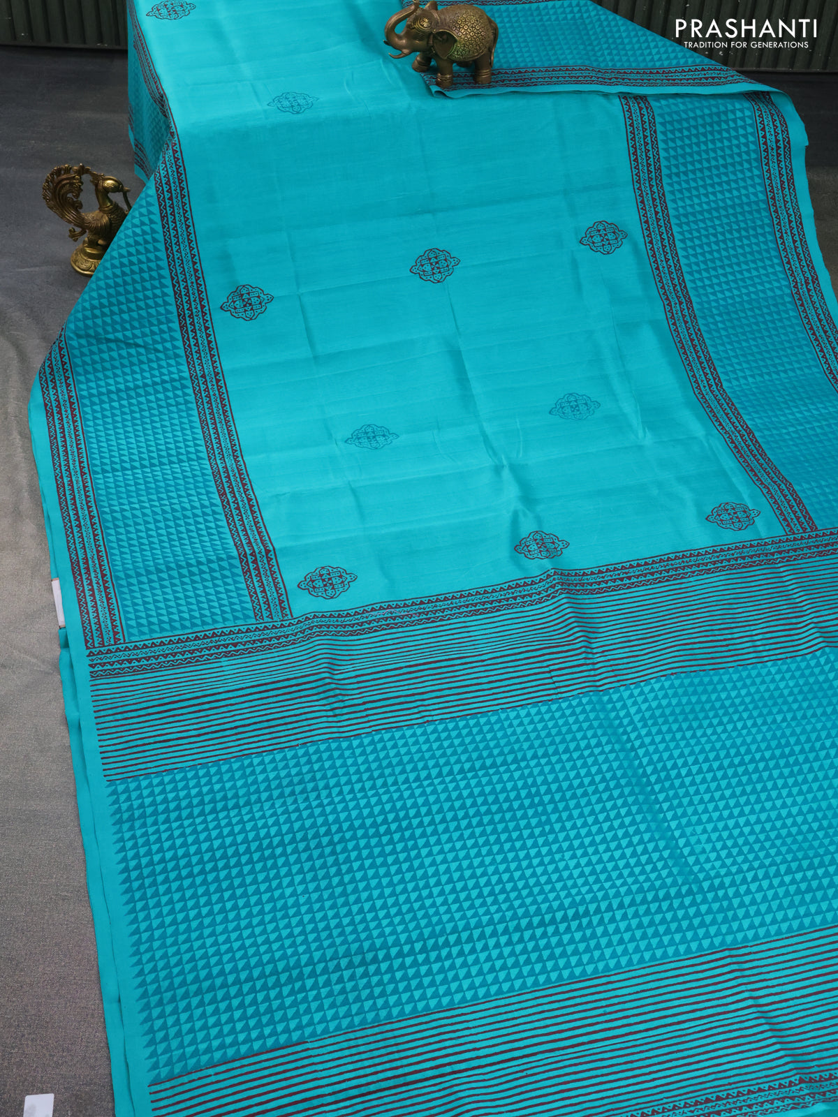 Silk cotton block printed saree teal blue with butta prints and printed border