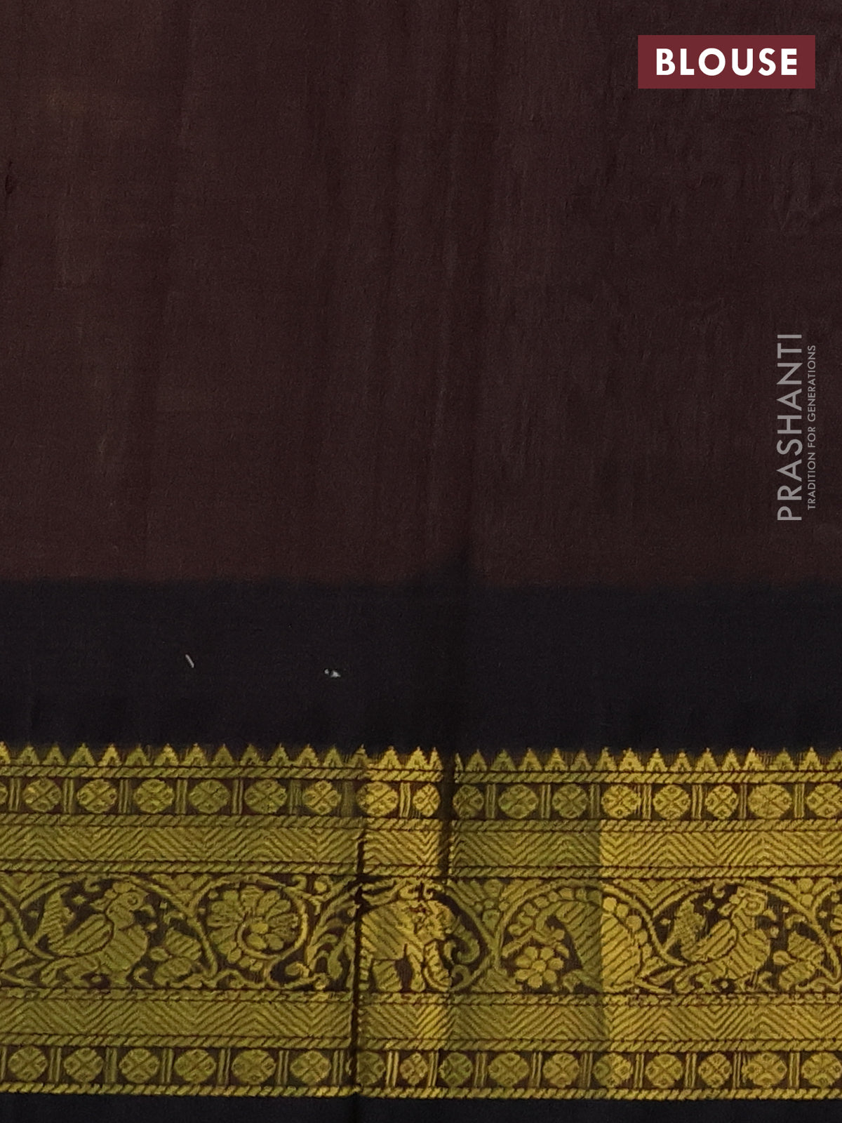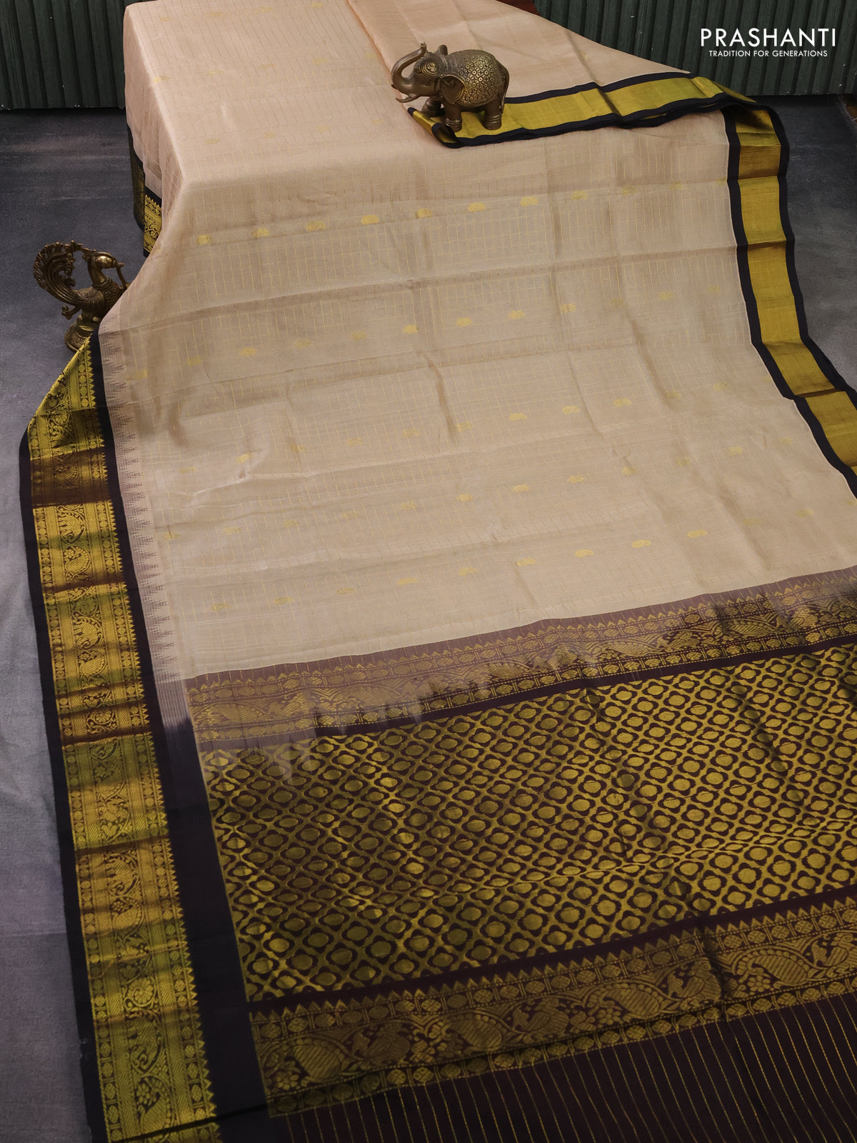 Silk cotton saree beifge and coffee brown with allover zari checks & buttas and temple design zari woven korvai border
