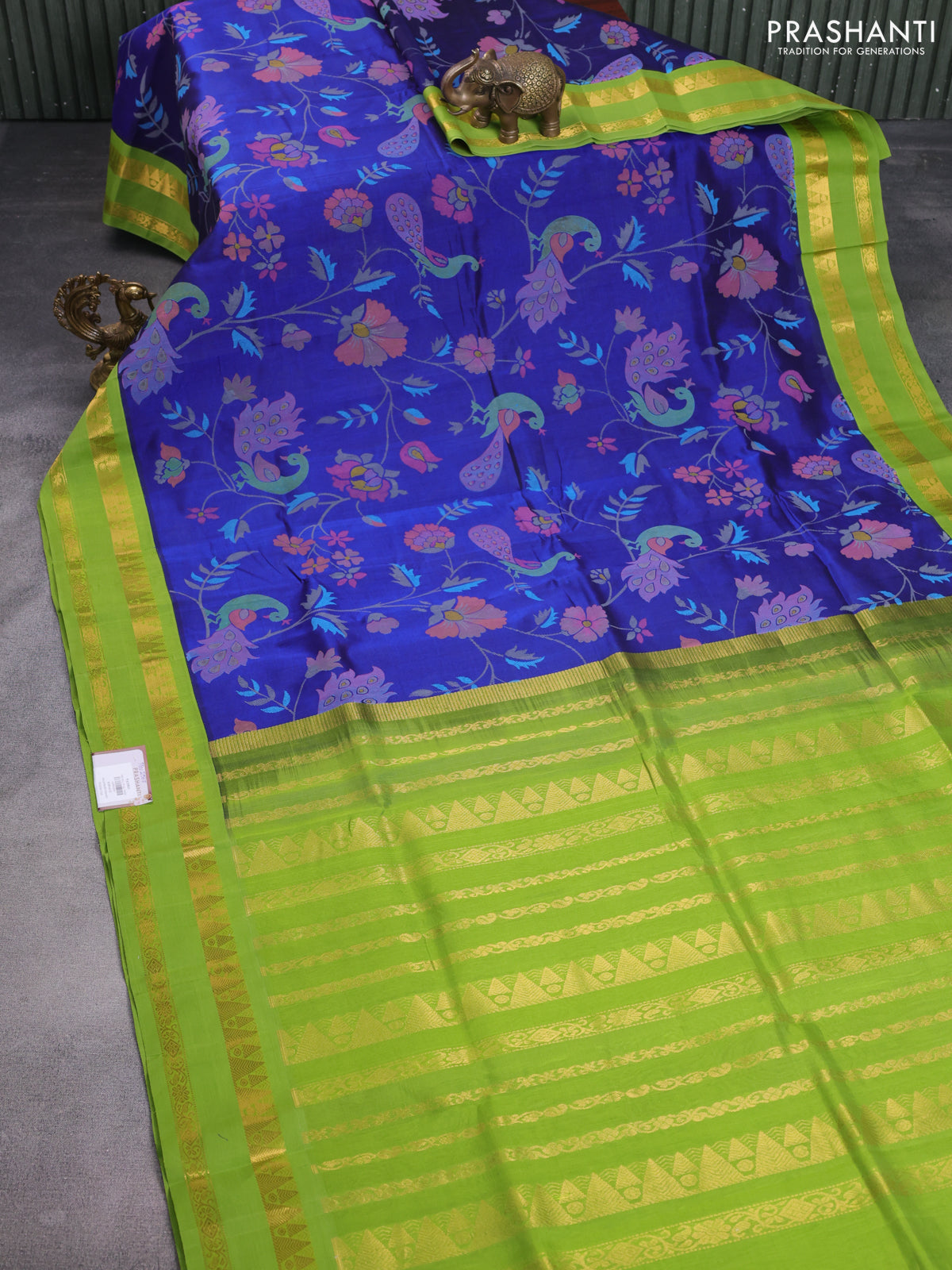 Silk cotton saree blue and green with allover kalamkari prints and zari woven korvai border
