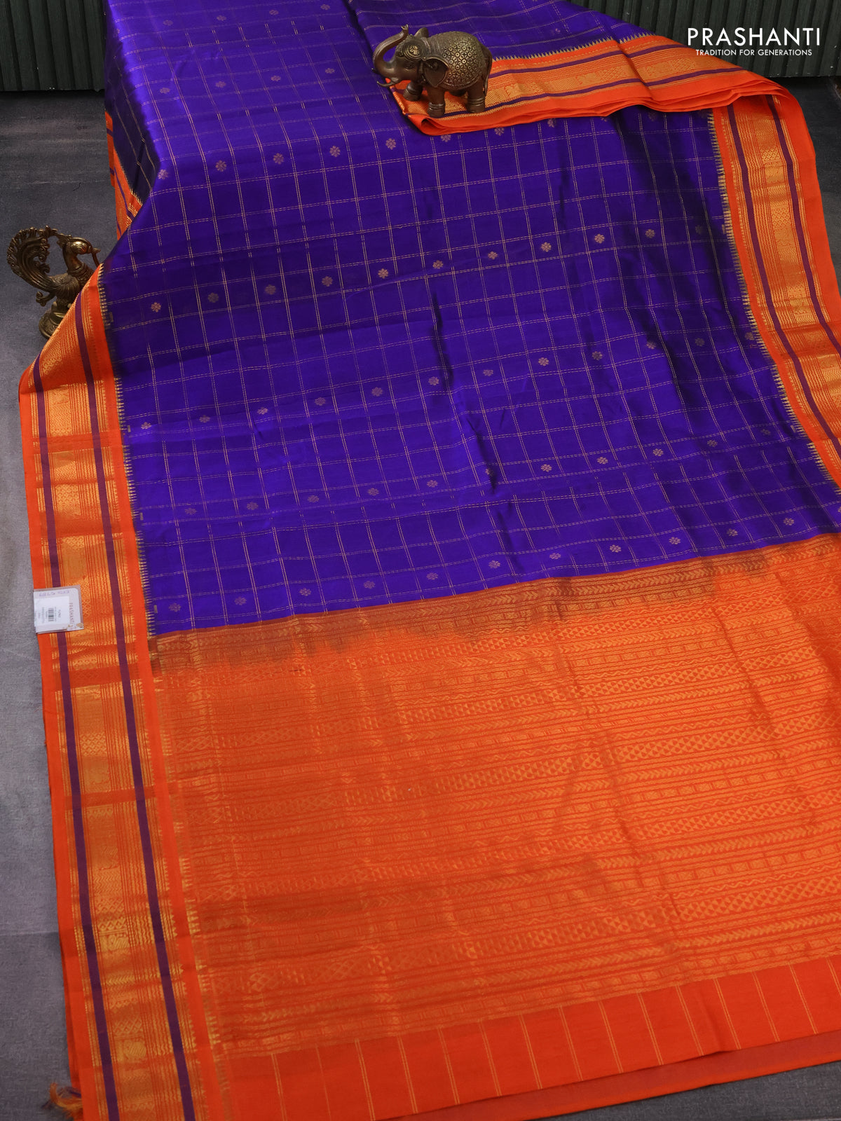 Silk cotton saree blue and orange with allover zari checks & buttas and zari woven korvai border