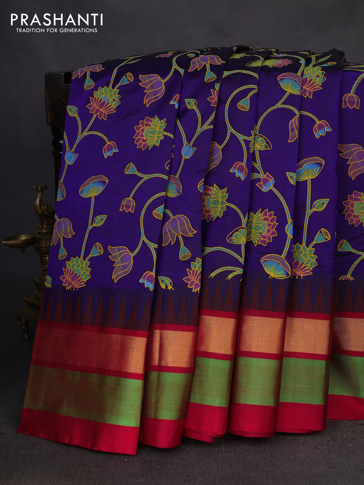 Silk cotton saree blue and red with allover pichwai prints and temple design zari woven simple border