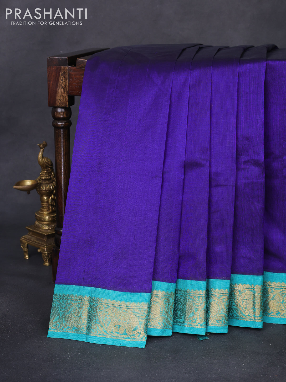 Silk cotton saree blue and teal blue with plain body and zari woven korvai border