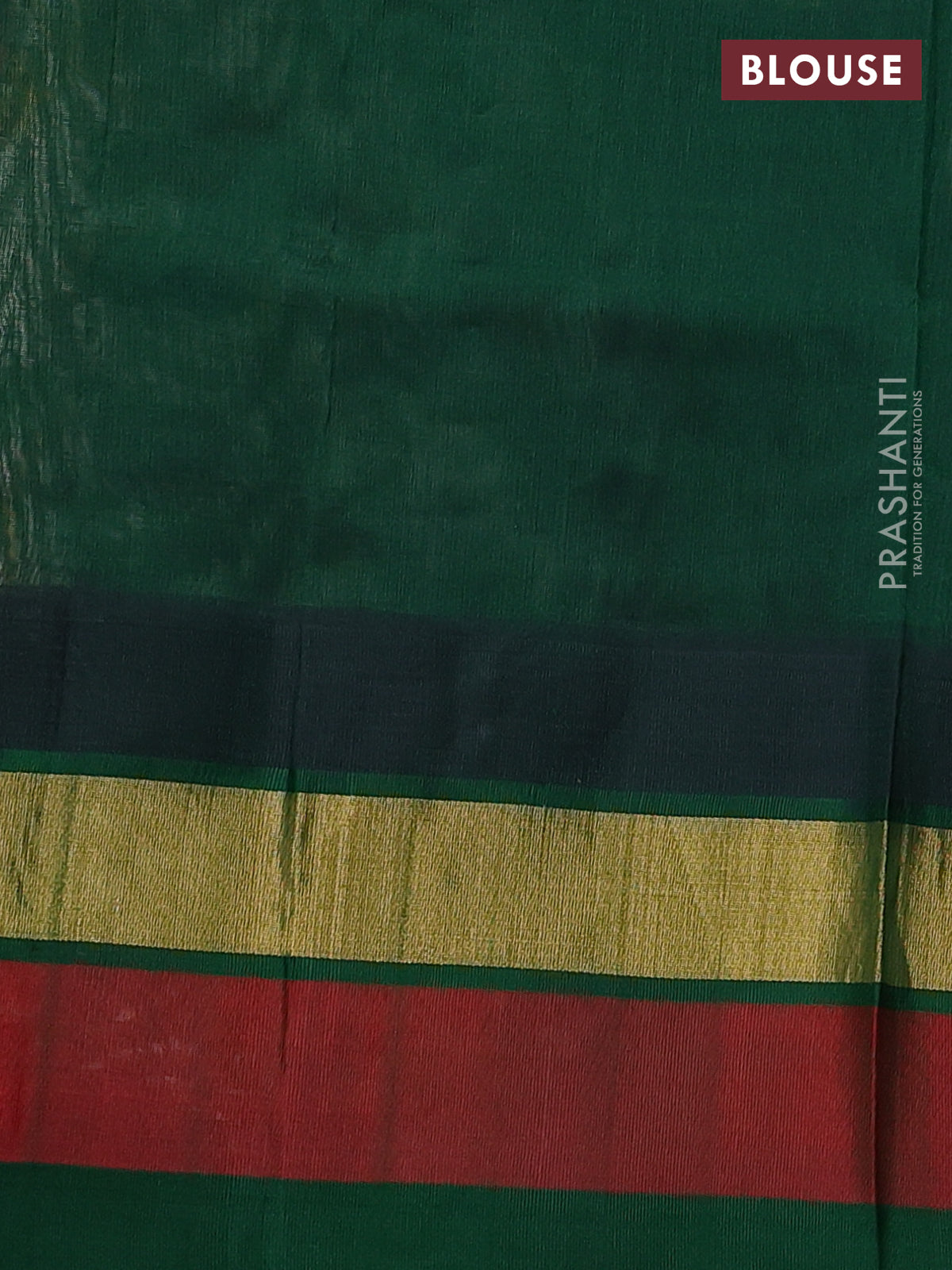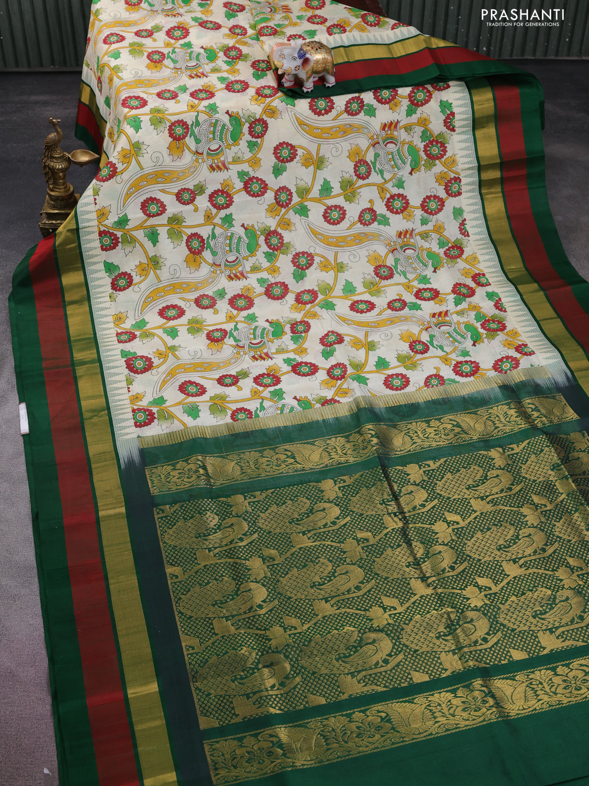 Silk cotton saree cream and green with allover kalamkari prints and temple design zari woven simple border