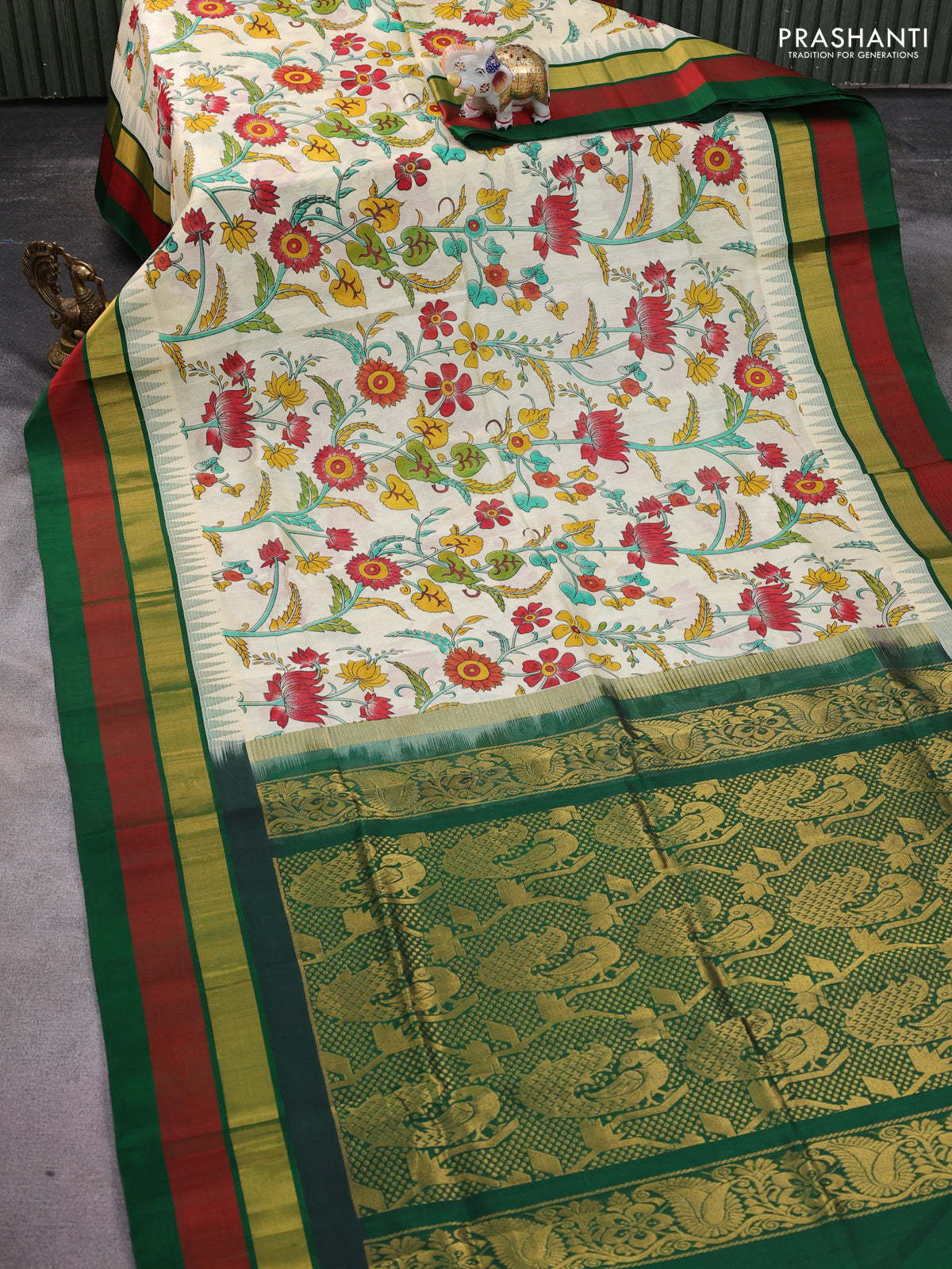 Silk cotton saree cream and green with allover kalamkari prints and temple design zari woven simple border
