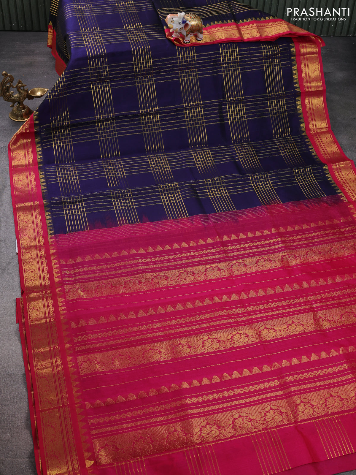Silk cotton saree dark blue and pink with allover zari checked pattern and zari woven korvai border