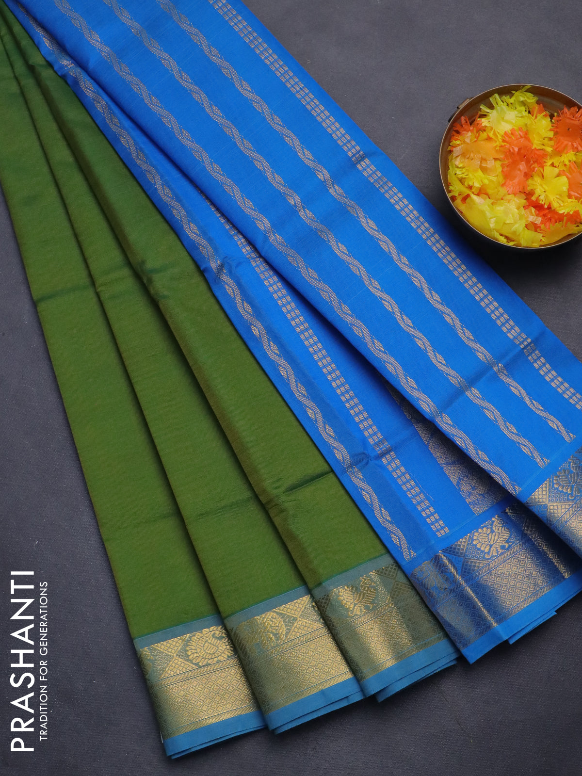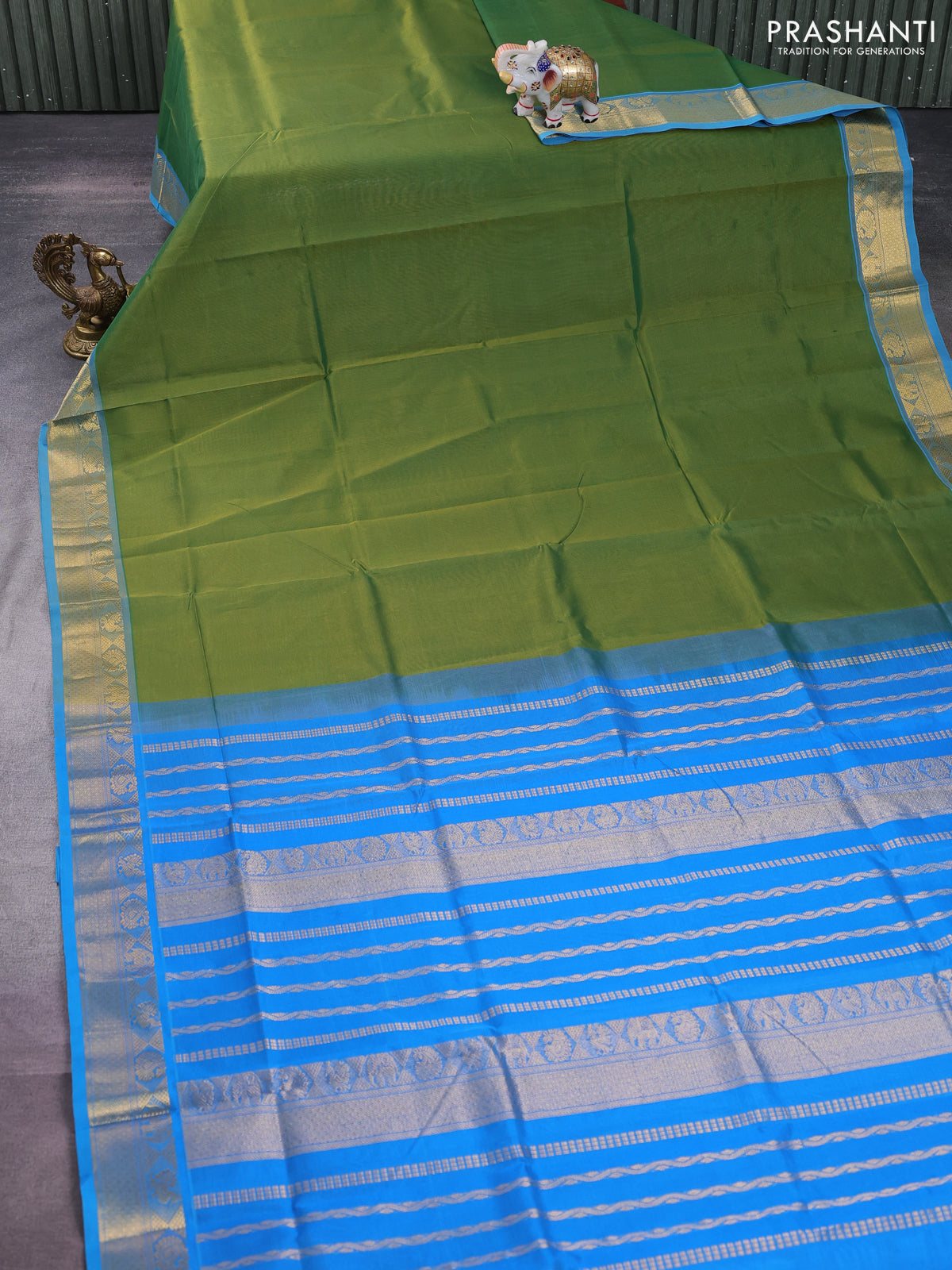 Silk cotton saree green and cs blue with plain body and zari woven border