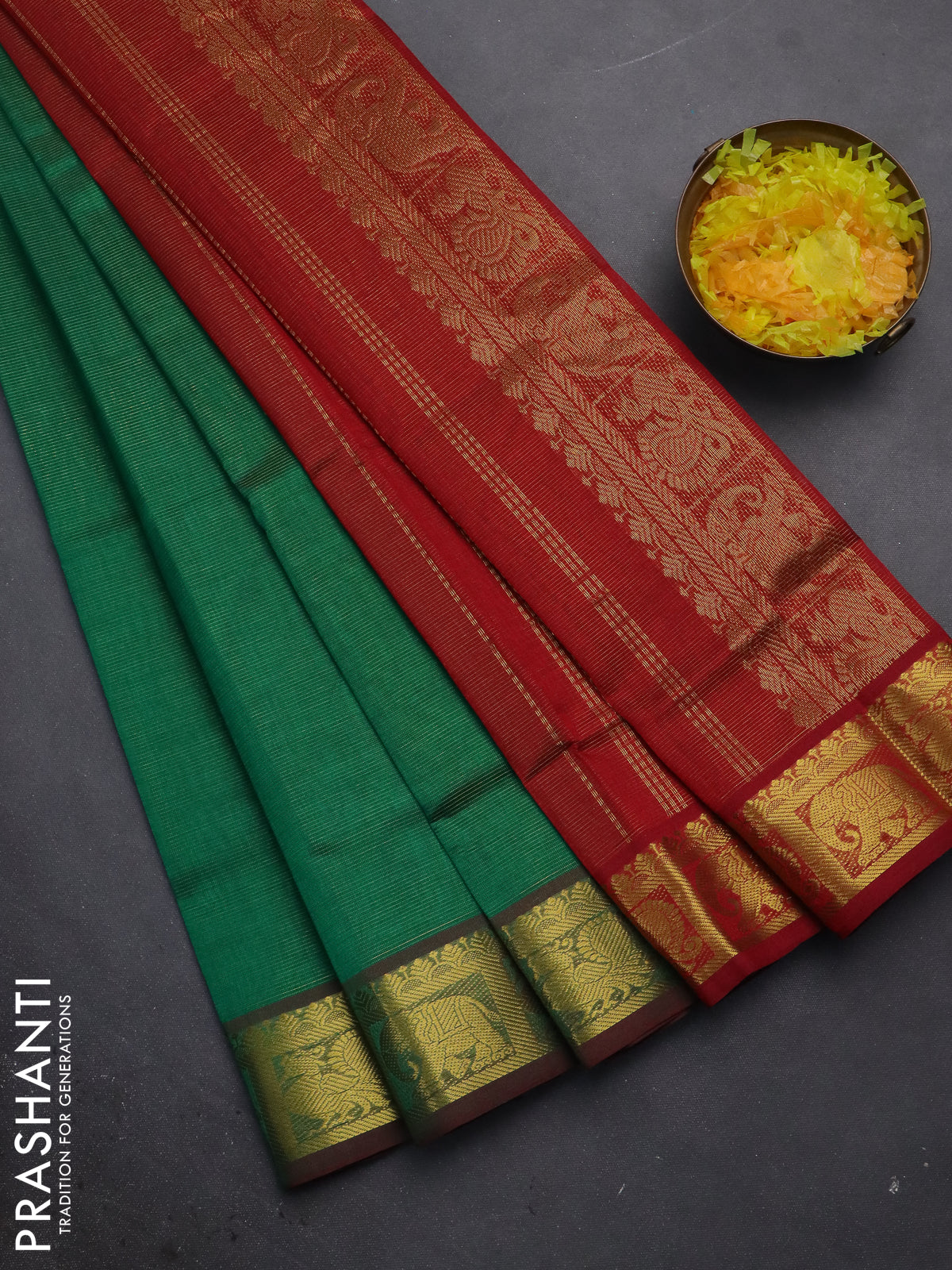Silk cotton saree green and maroon with allover vairosi pattern and zari woven border