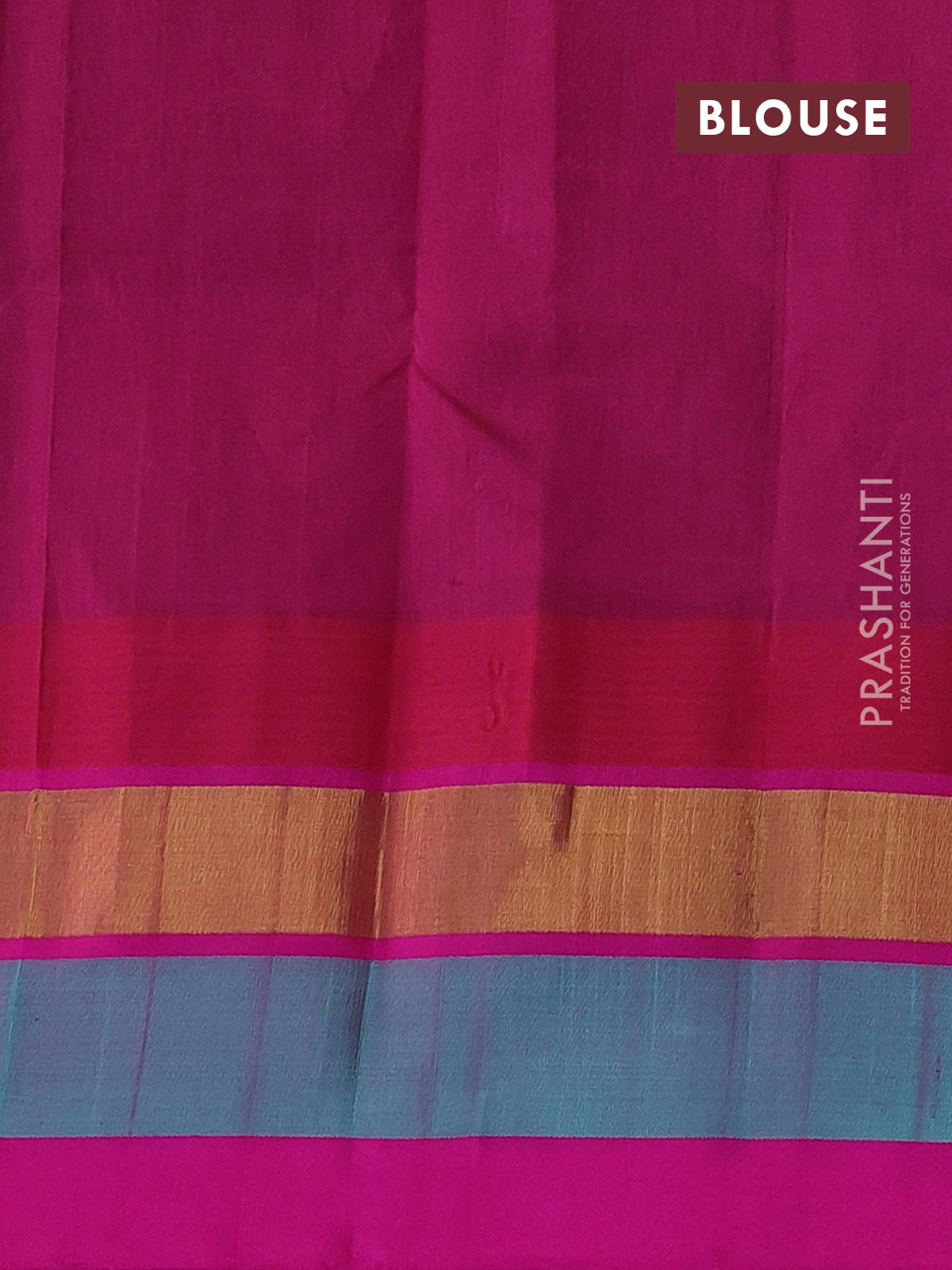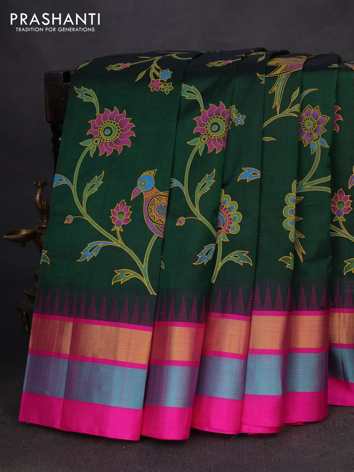 Silk cotton saree green and pink with allover kalamkari prints and temple design zari woven simple border