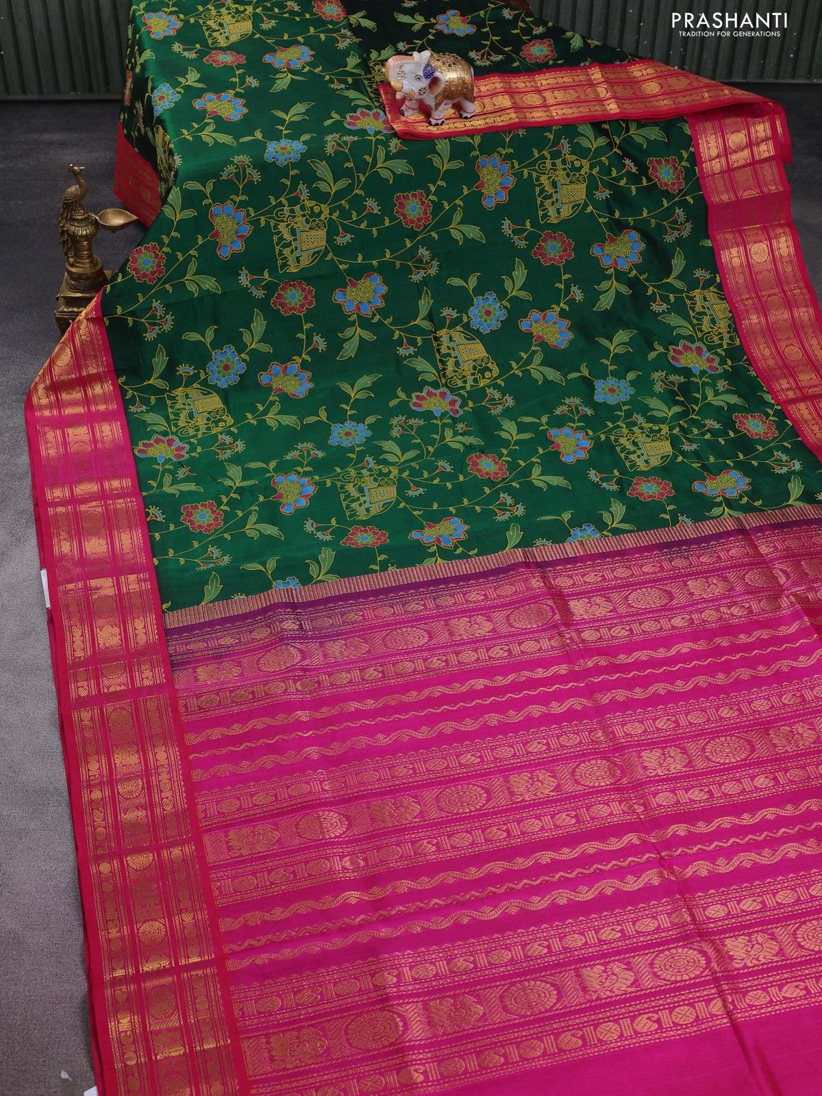 Silk cotton saree green and pink with allover kalamkari prints and zari woven korvai border