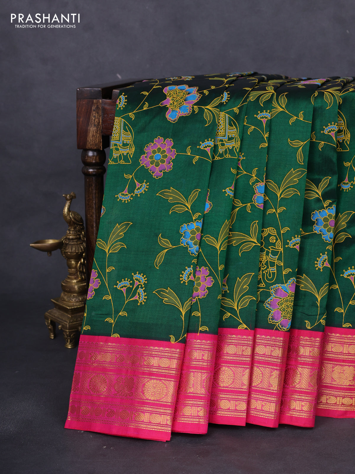 Silk cotton saree green and pink with allover kalamkari prints and zari woven korvai border
