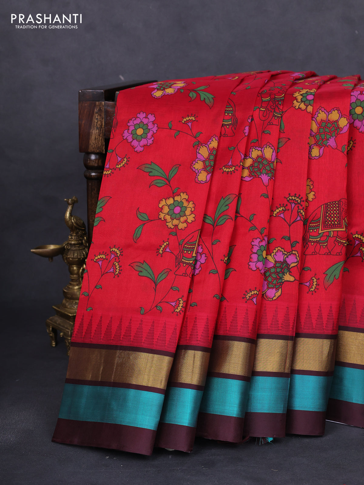 Silk cotton saree kumkum red and deep maroon with allover kalamkari prints and temple design zari woven simple border