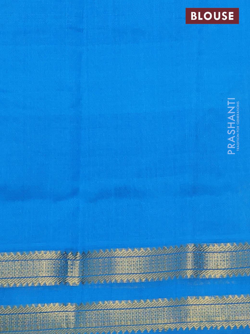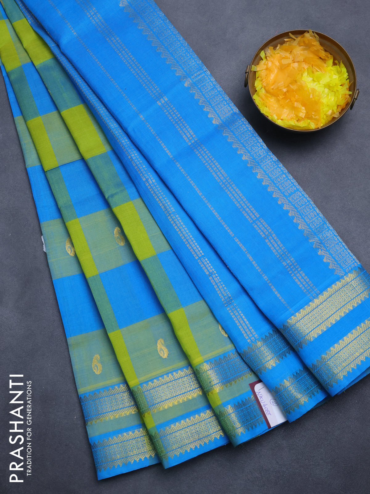 Silk cotton saree light green and cs blue with allover paalum pazham checks & paisley zari buttas and zari woven border