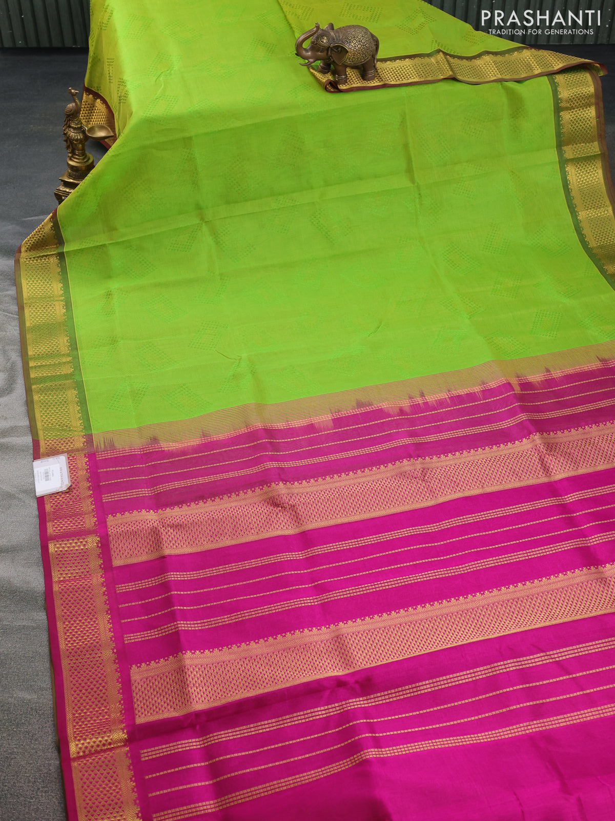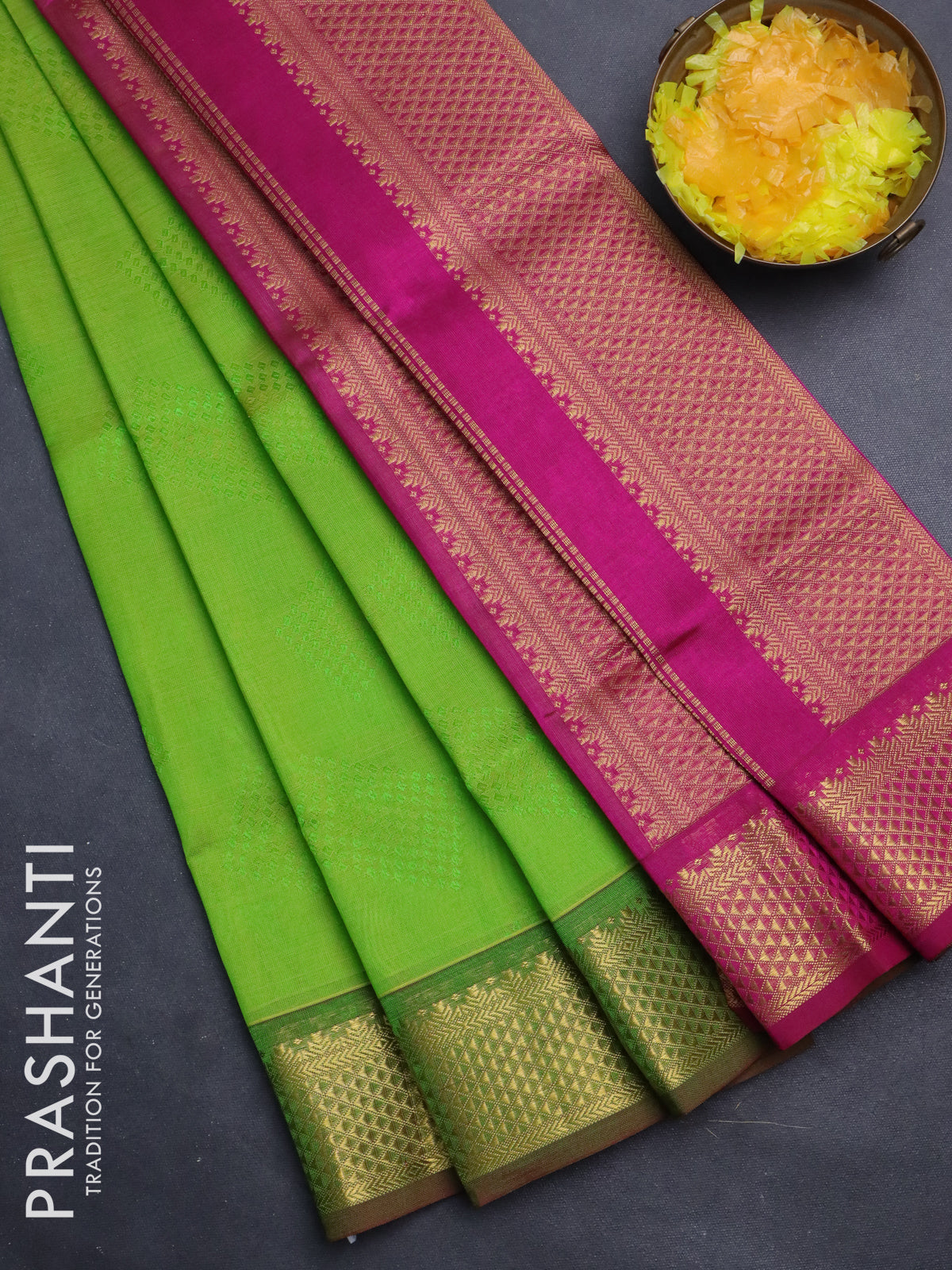Silk cotton saree light green and magenta pink with allover self emboss jacquard and zari woven border