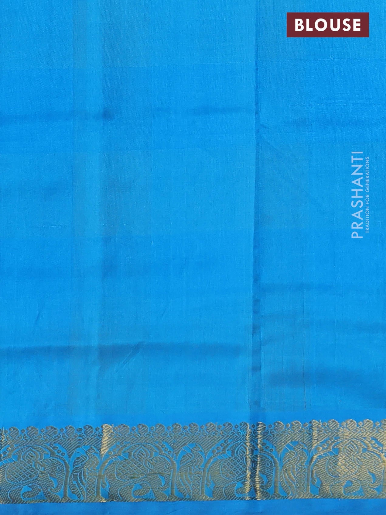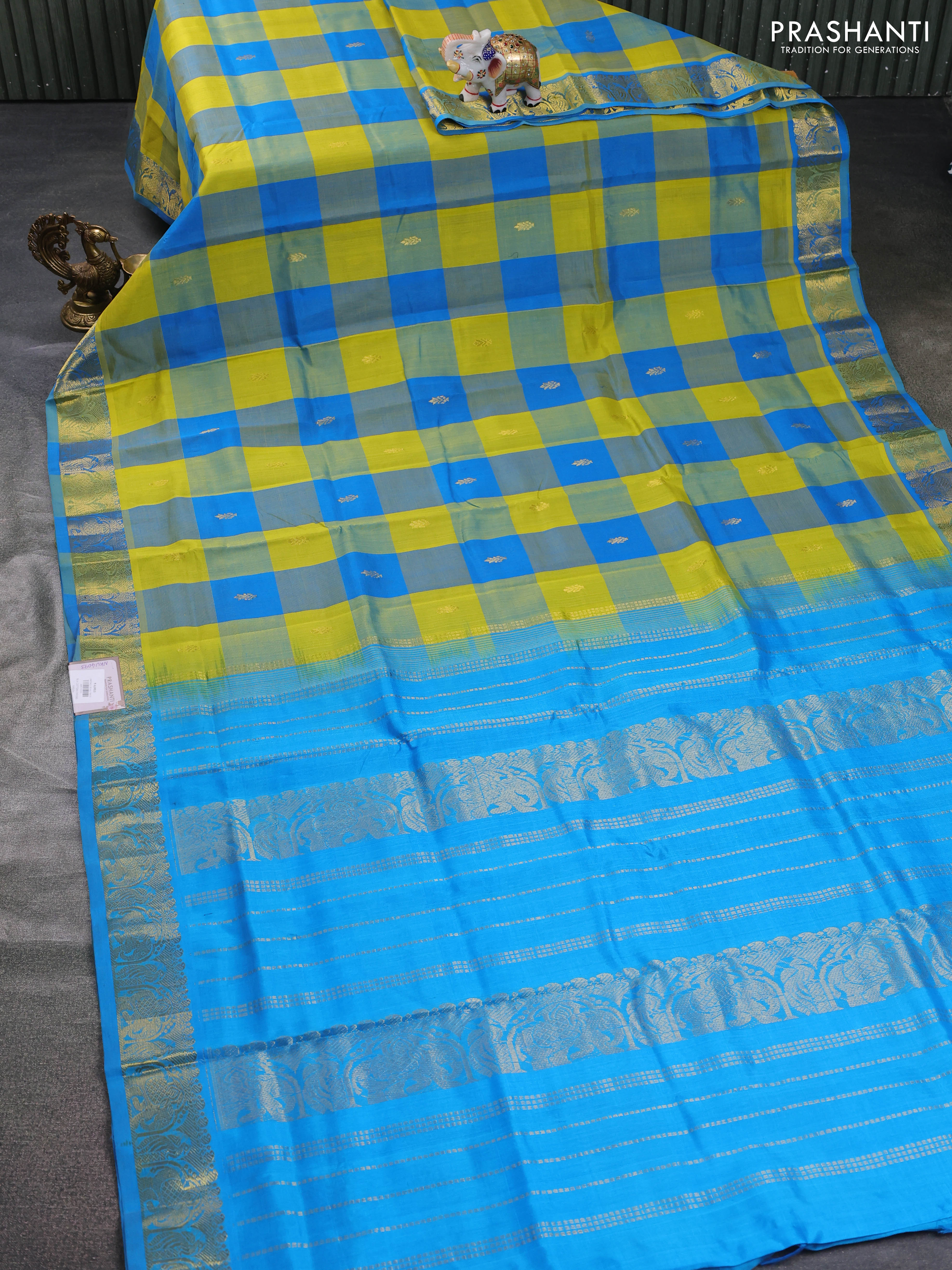 Silk cotton saree lime yellow and cs blue with allover paalum pazham checks & zari buttas and elephant zari woven border