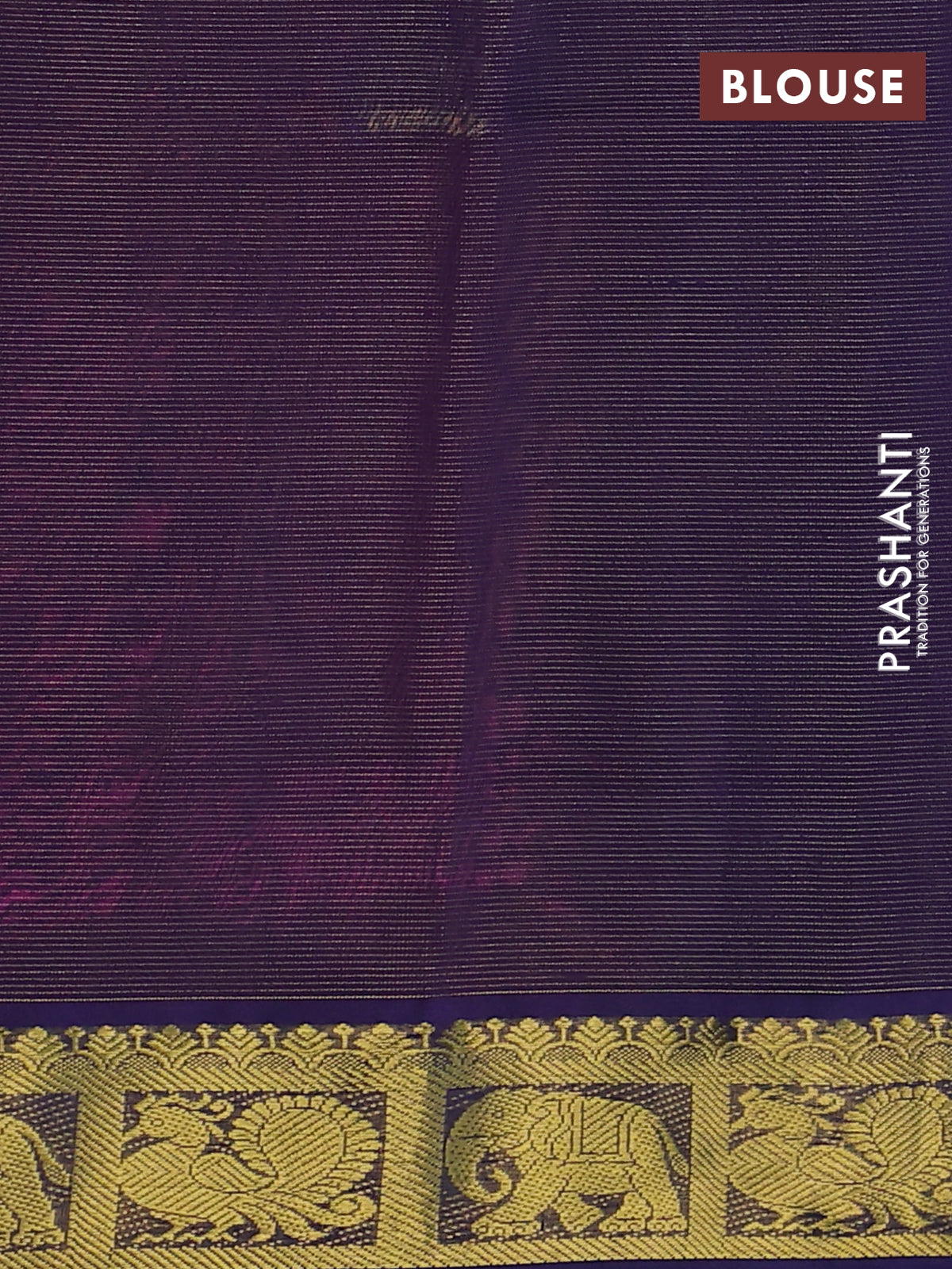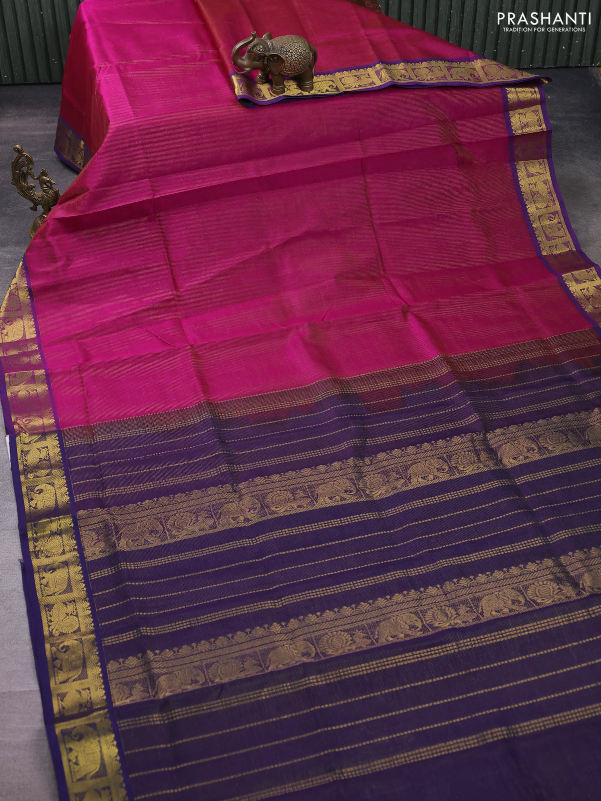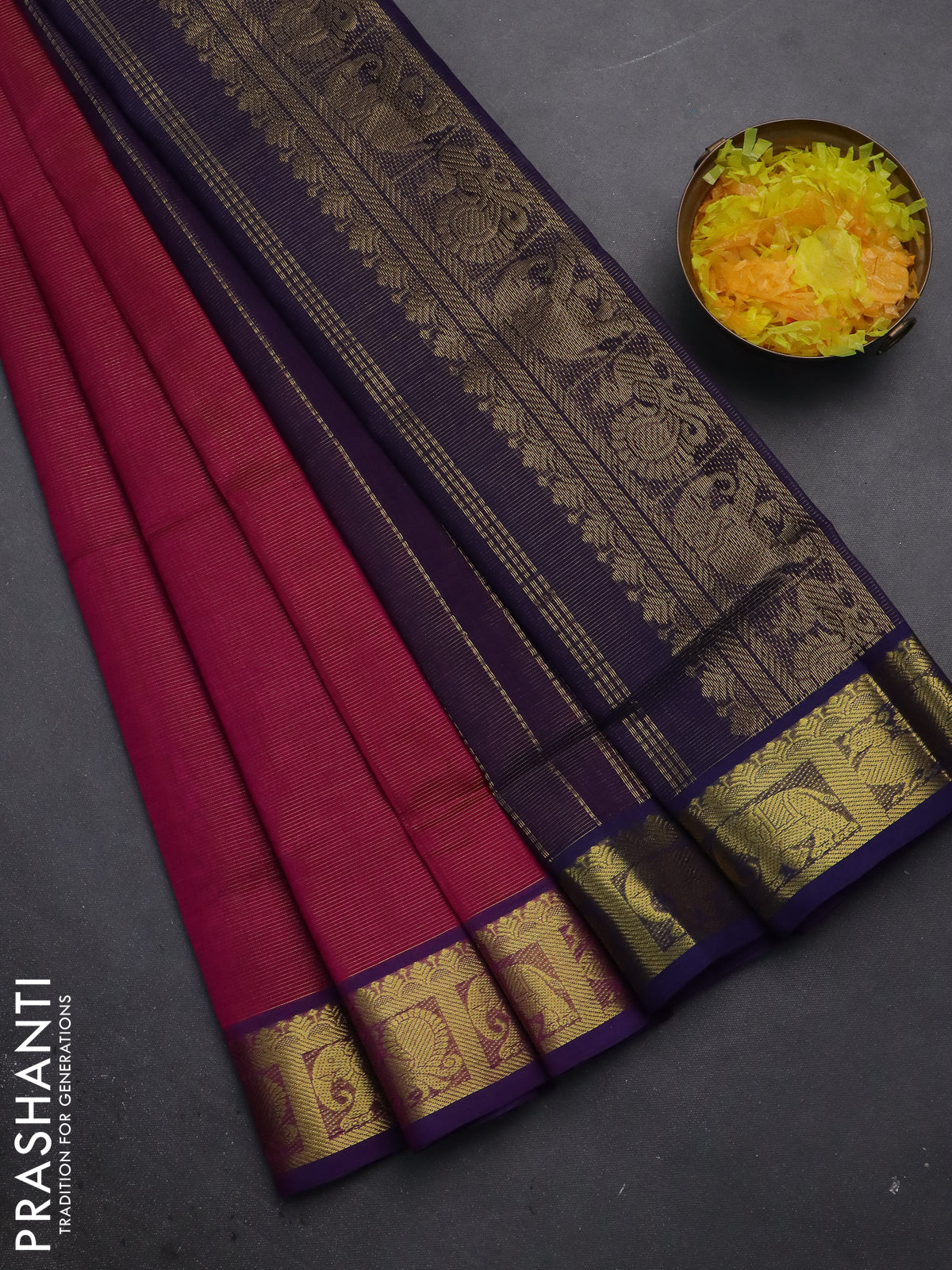 Silk cotton saree magenta pink and blue with allover vairosi pattern and zari woven border