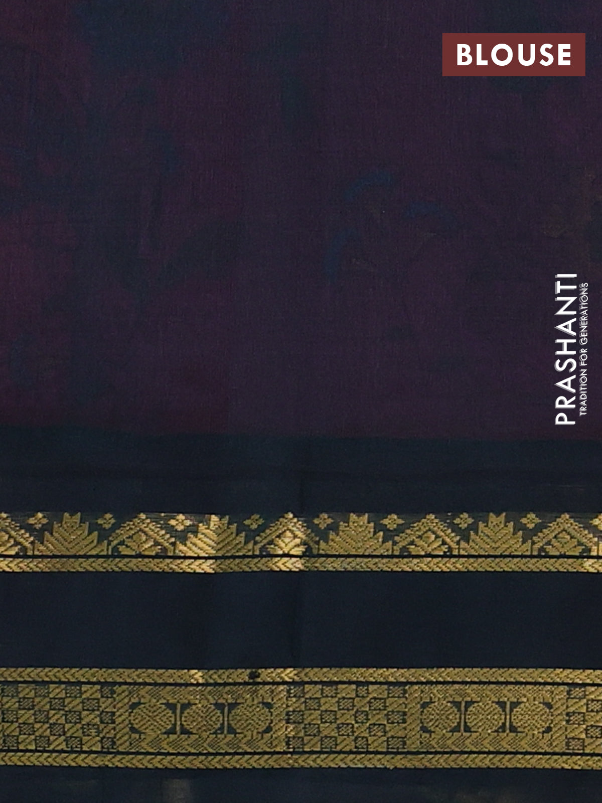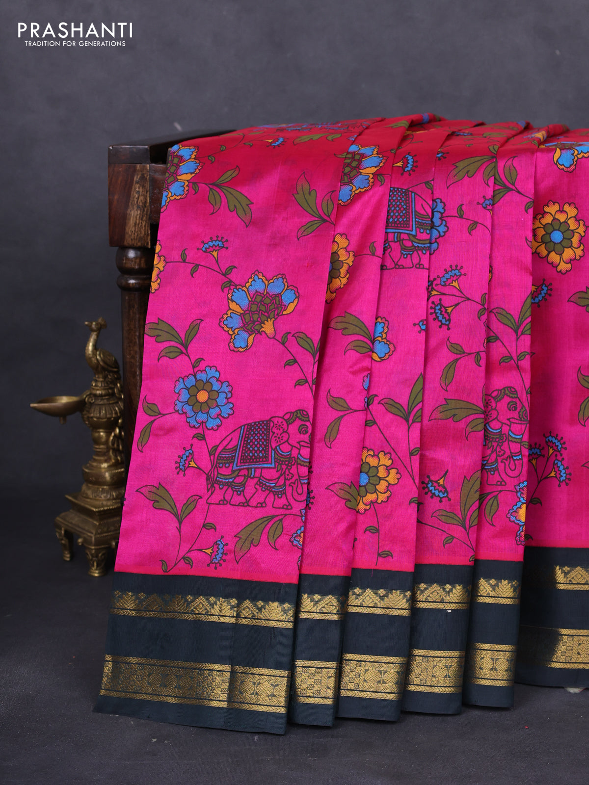 Silk cotton saree magenta pink and bottle green with allover kalamkari prints and rettapet zari woven korvai border