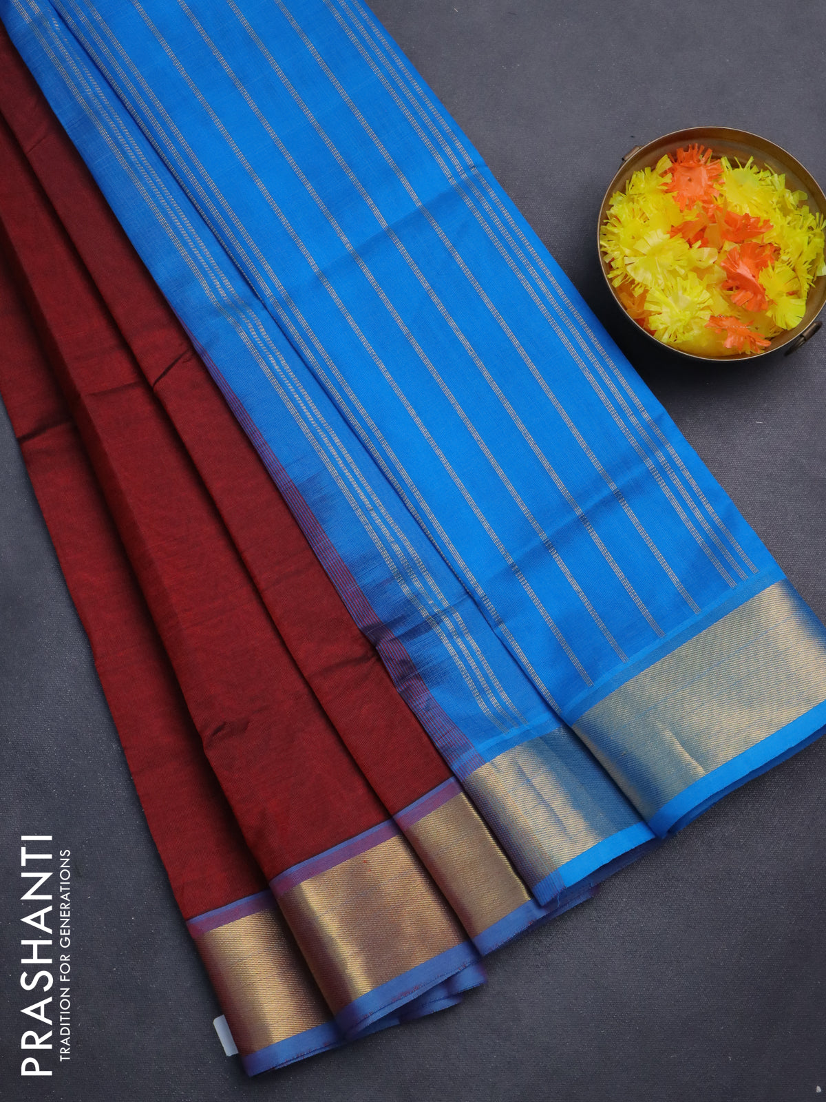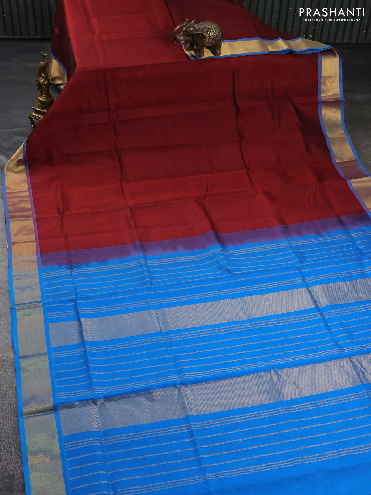 Silk cotton saree maroon and cs blue with plain body and zari woven border