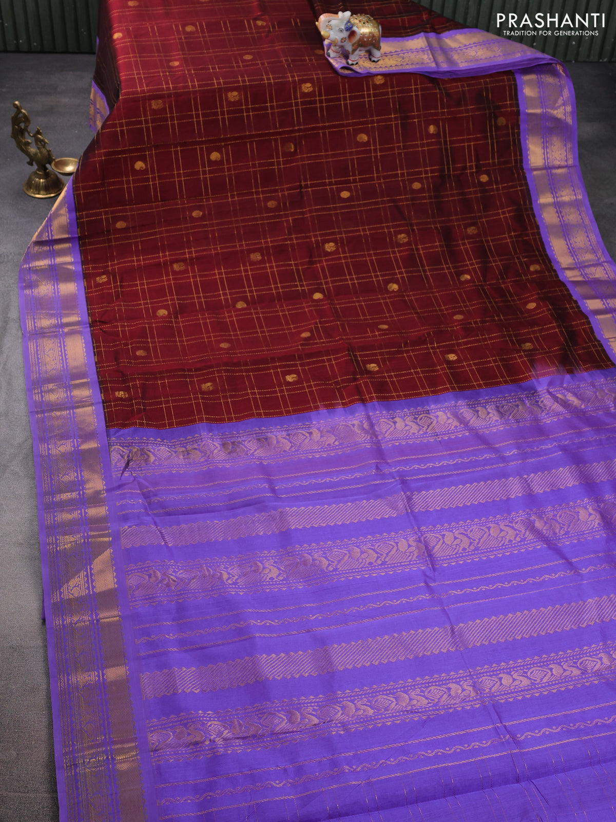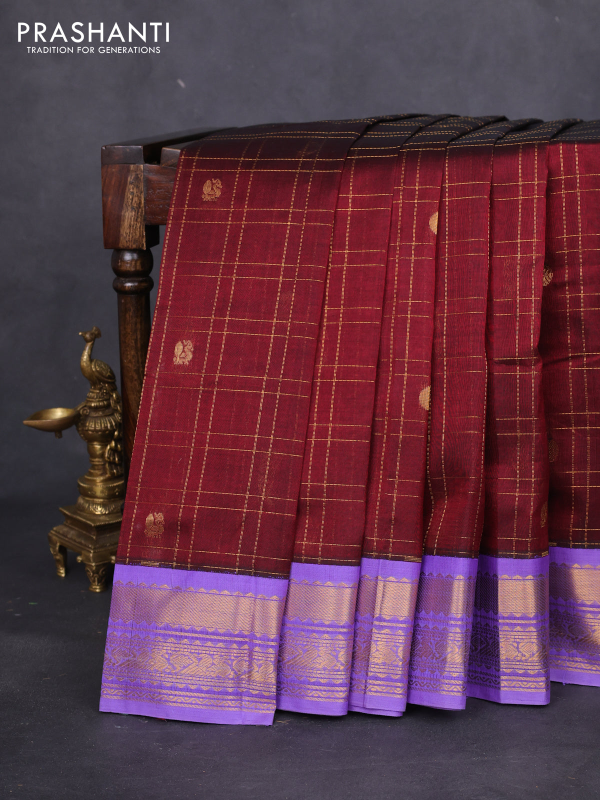 Silk cotton saree maroon and lavender with allover zari checks & buttas and zari woven korvai border