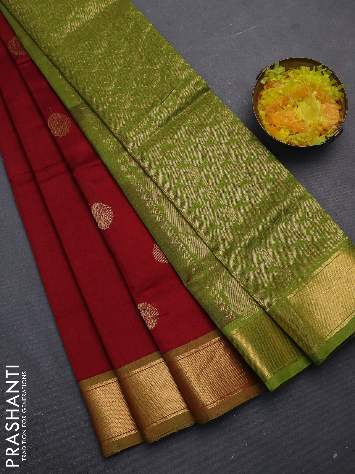 Silk cotton saree maroon and light green with zari woven coin buttas and zari woven border