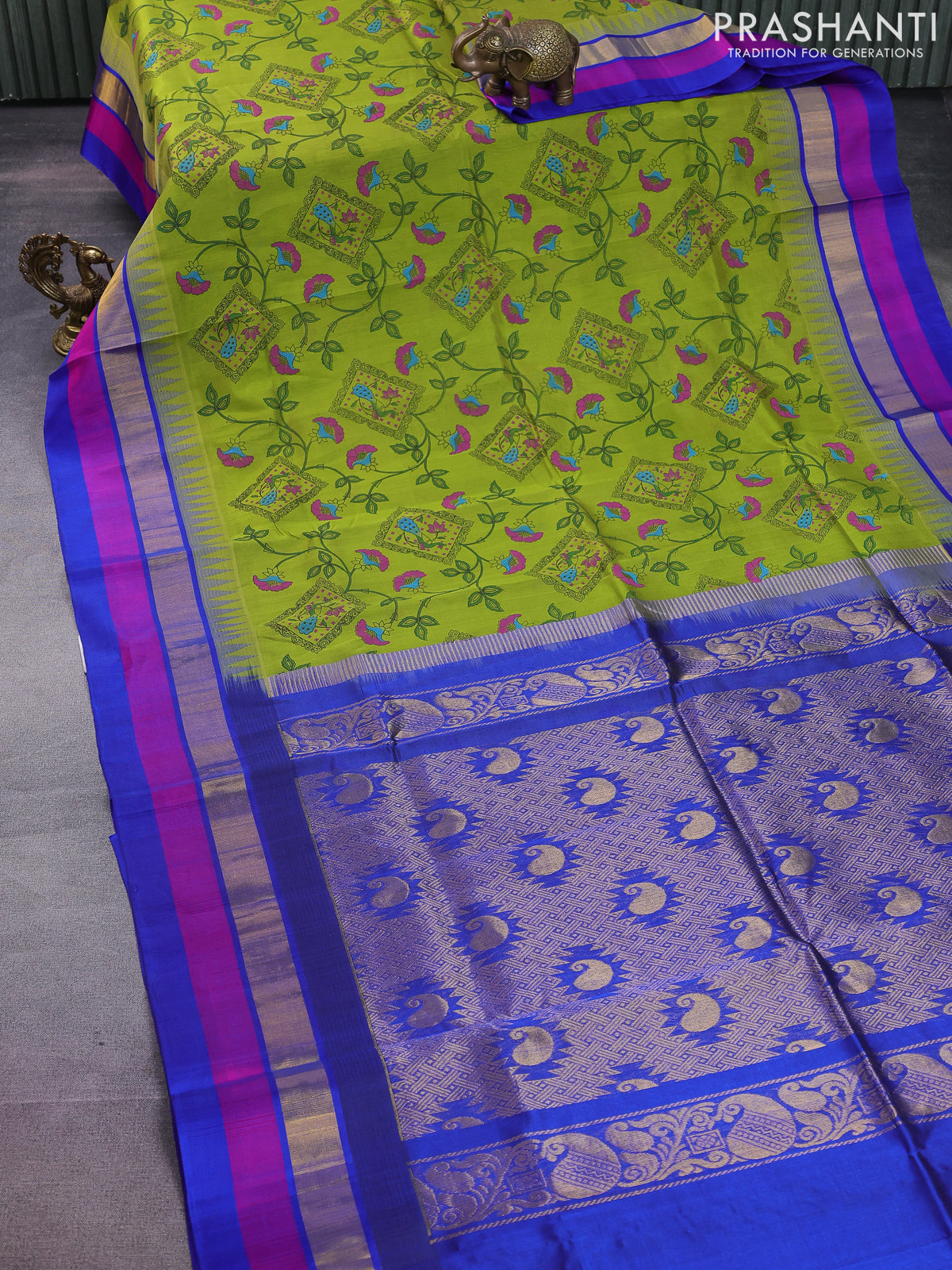 Silk cotton saree mehendi green and blue with allover kalamkari prints and temple design zari woven simple border