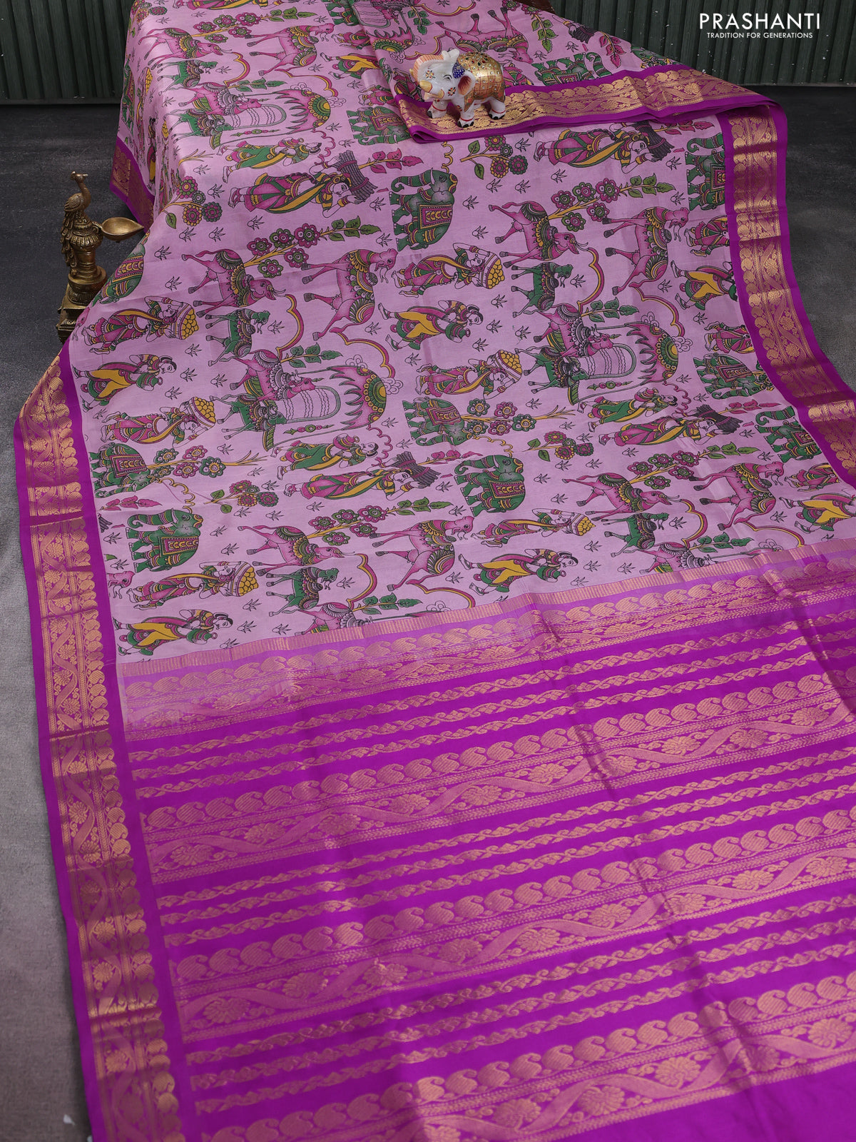 Silk cotton saree mild lavender and purple with allover kalamkari prints and zari woven korvai border