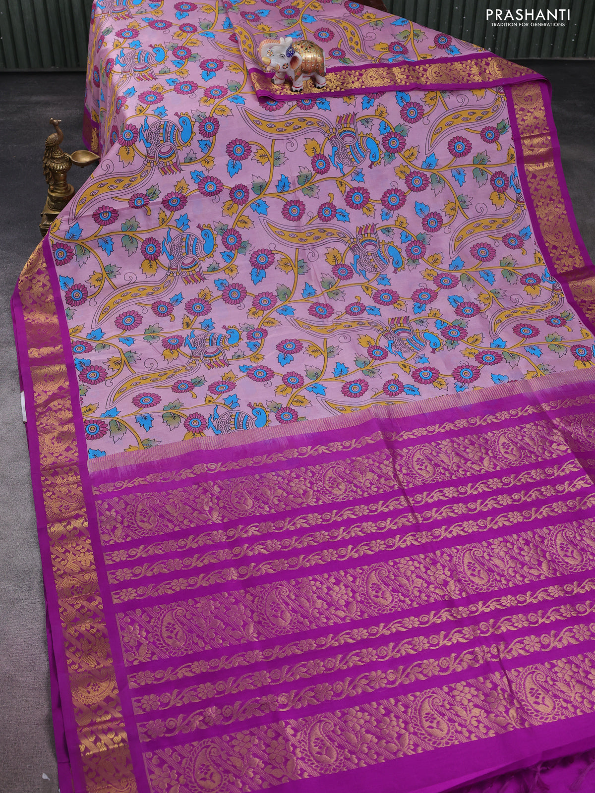 Silk cotton saree mild lavender and purple with allover kalamkari prints and zari woven korvai border
