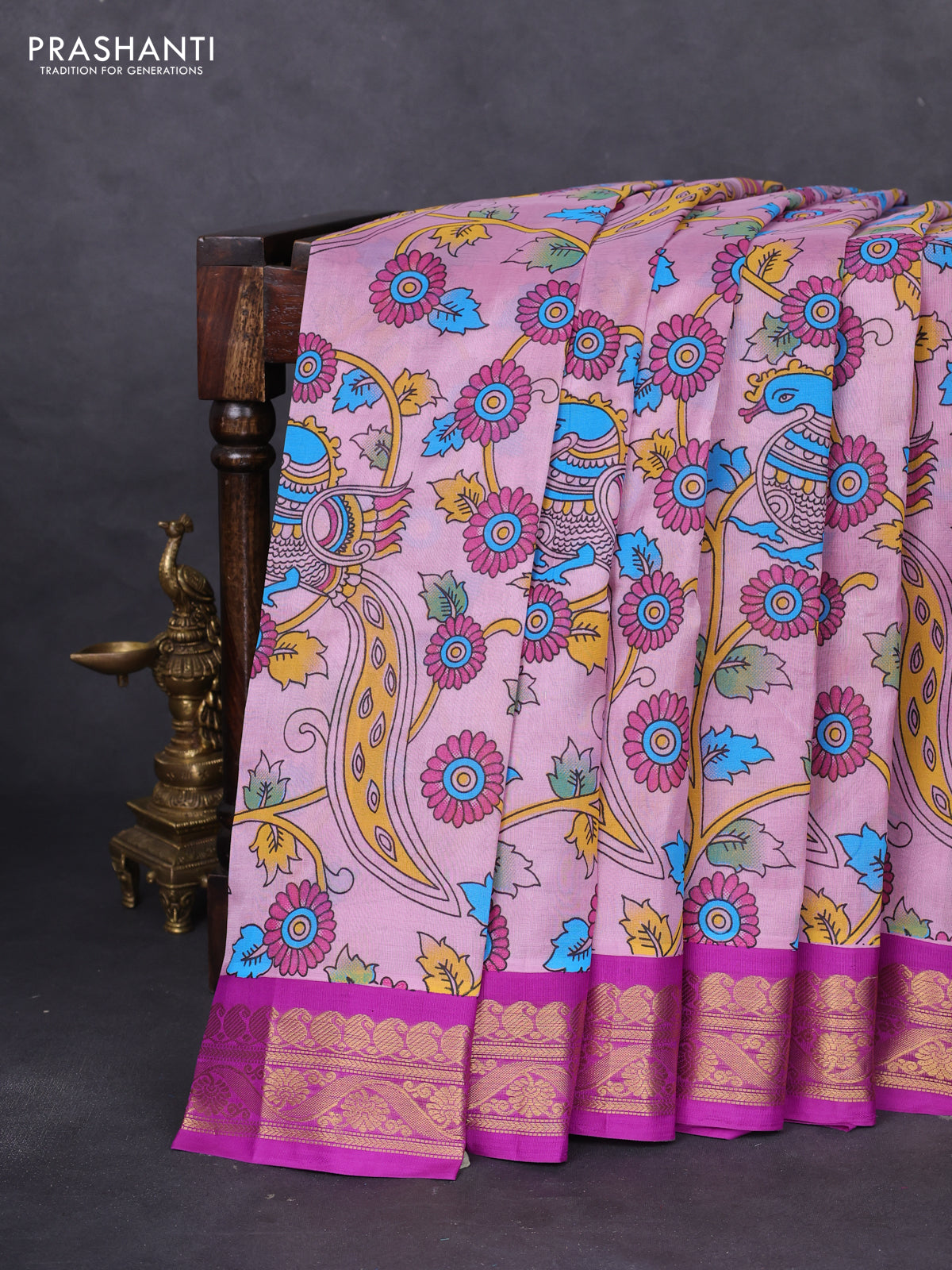 Silk cotton saree mild lavender and purple with allover kalamkari prints and zari woven korvai border