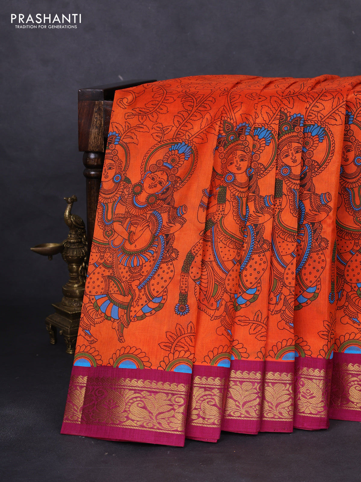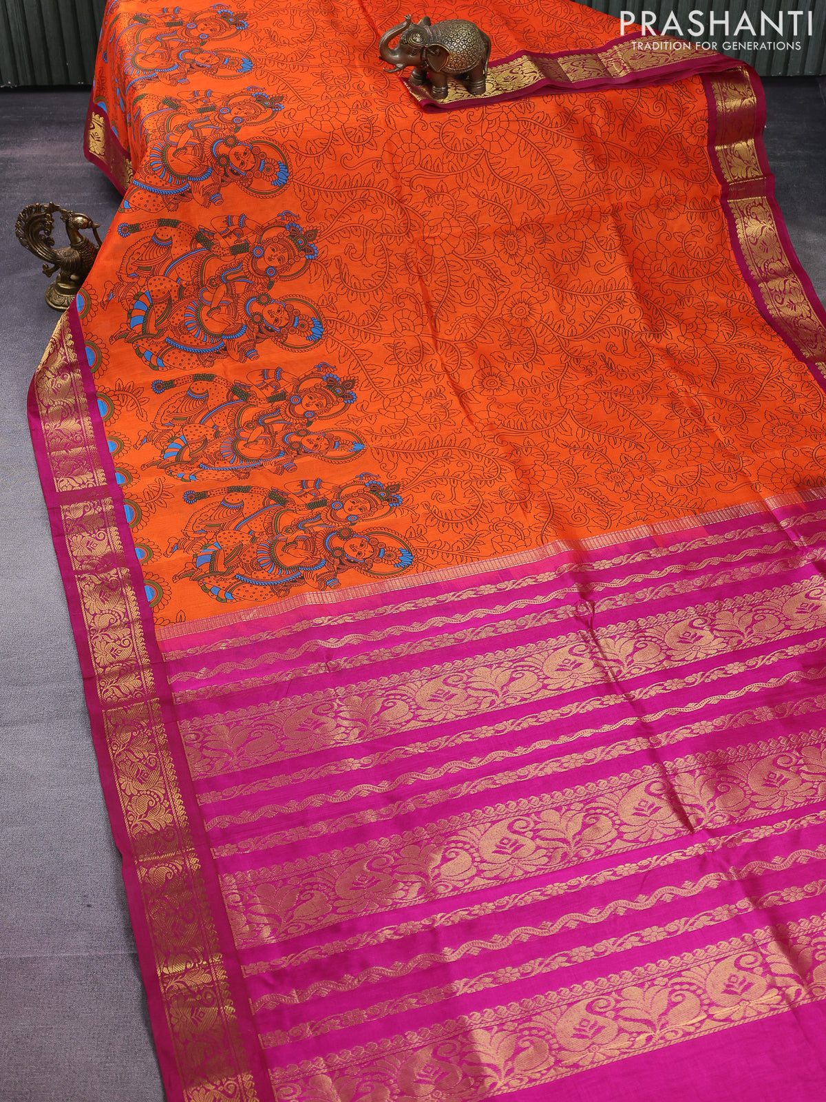 Silk cotton saree orange and magenta pink with allover kalamkari prints and zari woven korvai border