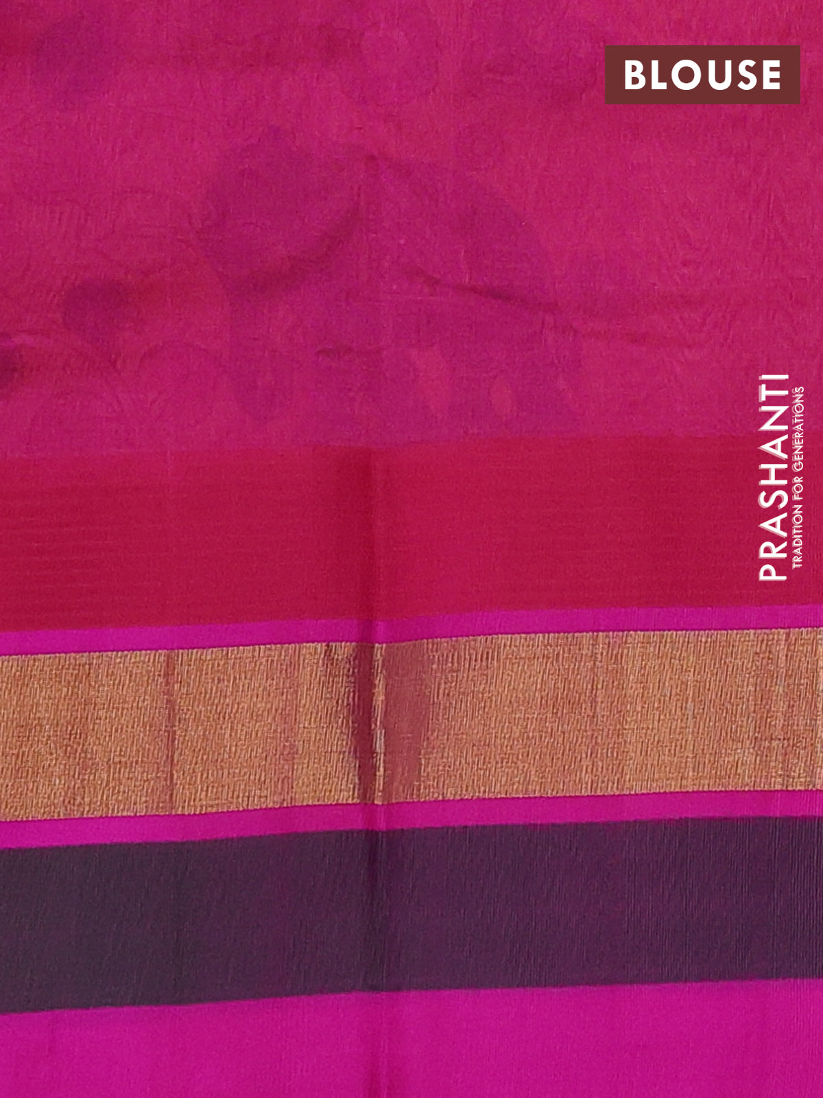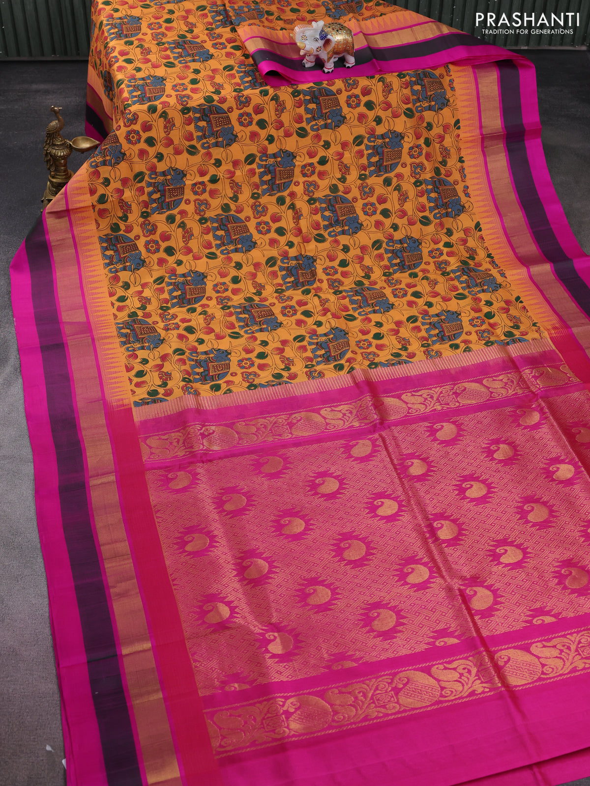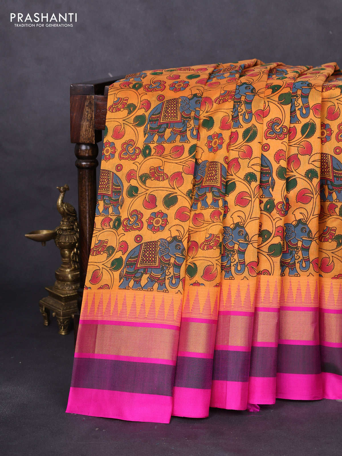 Silk cotton saree orange and pink with allover kalamkari prints and temple design zari woven simple border
