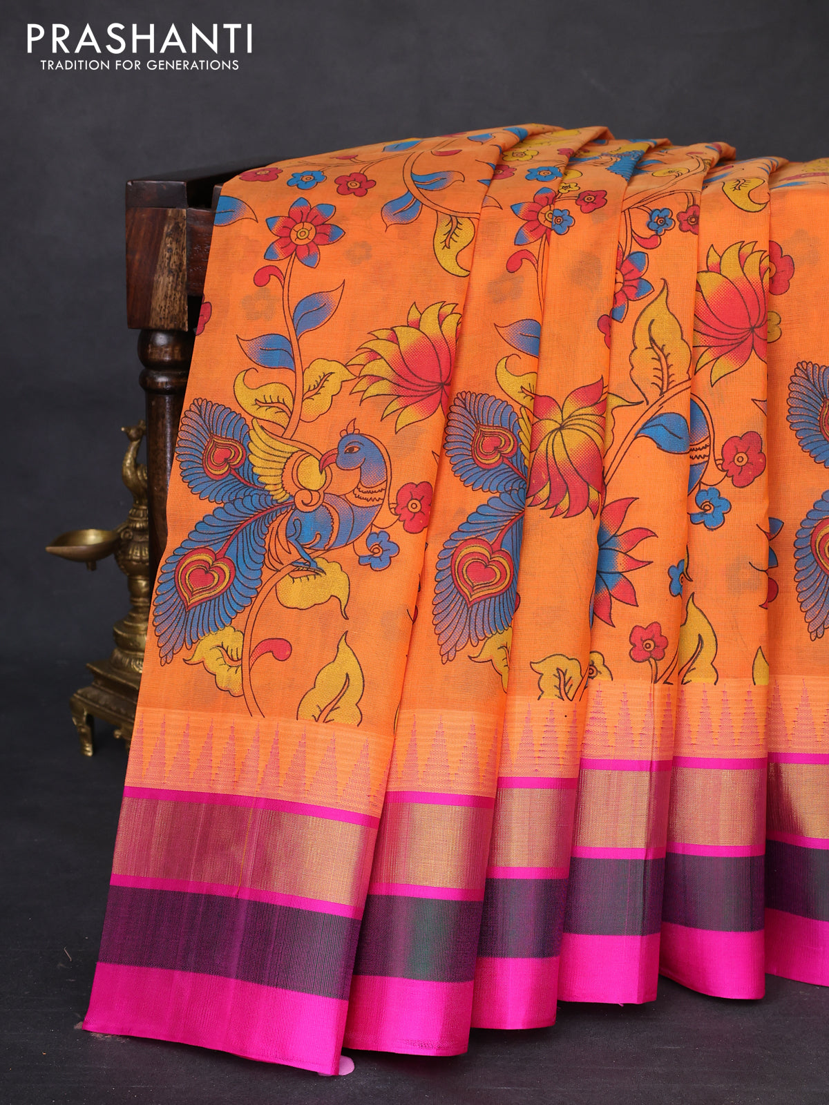 Silk cotton saree orange and pink with allover kalamkari prints and temple design zari woven simple border