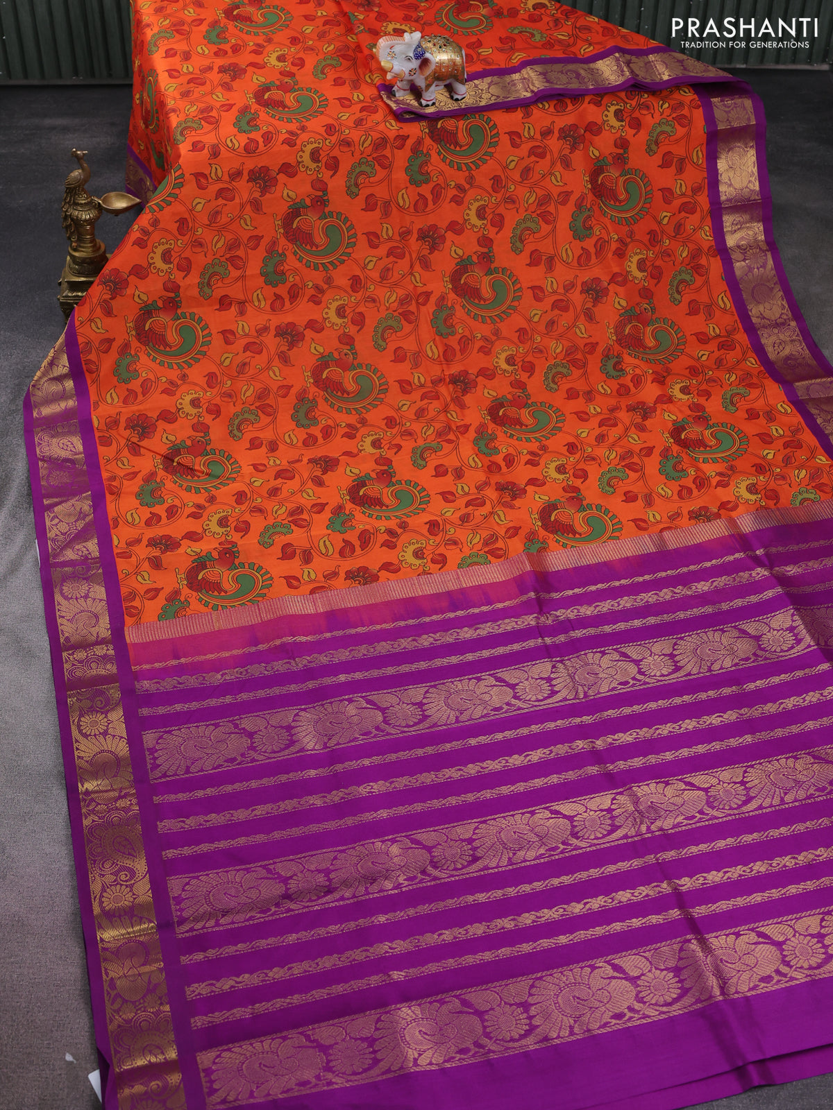 Silk cotton saree orange and purple with allover kalamkari prints and zari woven korvai border