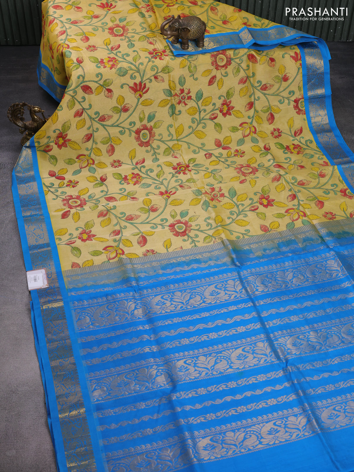 Silk cotton saree pale yellow and cs blue with allover kalamkari prints and zari woven korvai border