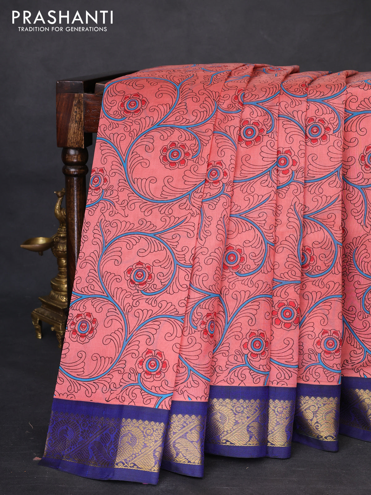 Silk cotton saree peach pink and blue with allover kalamkari prints and zari woven korvai border