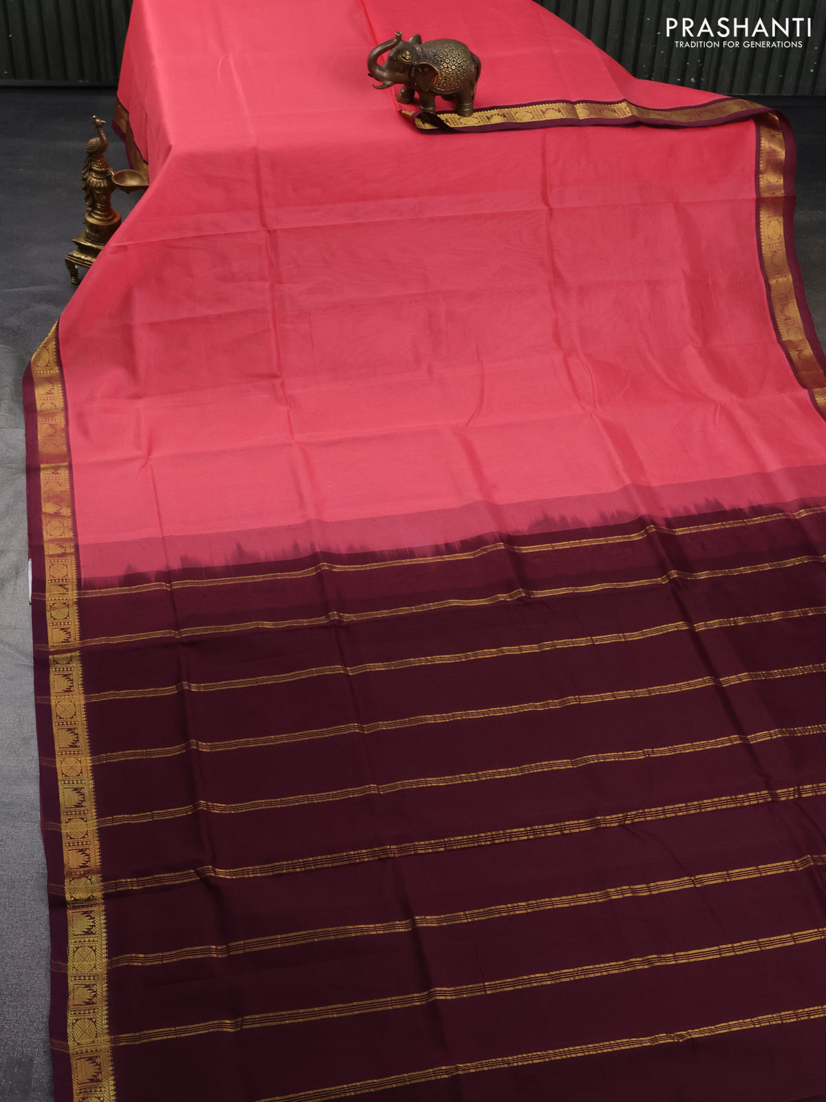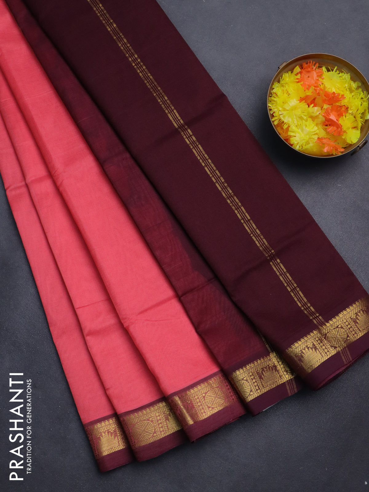 Silk cotton saree peach pink and deep maroon with plain body and zari woven border