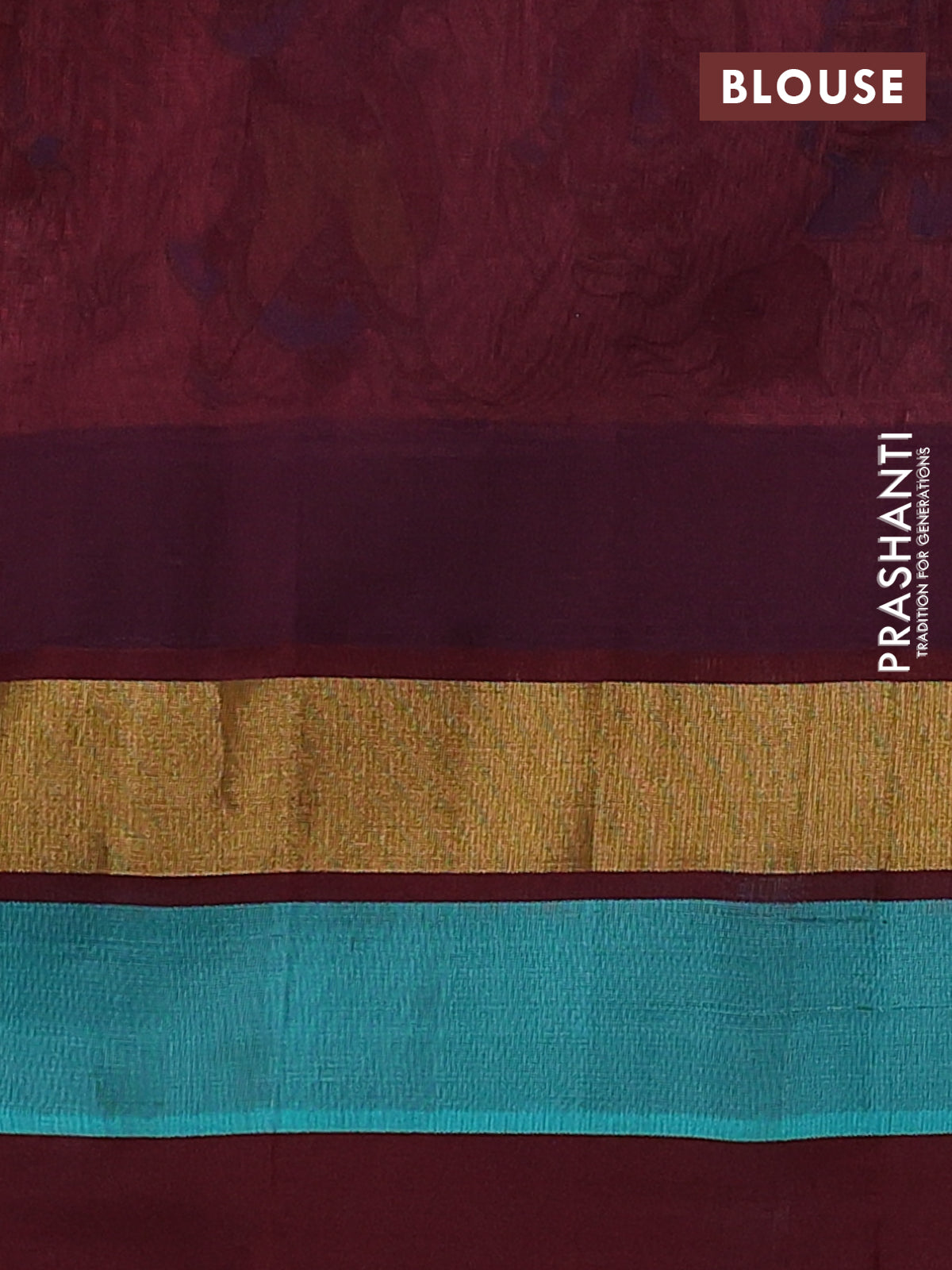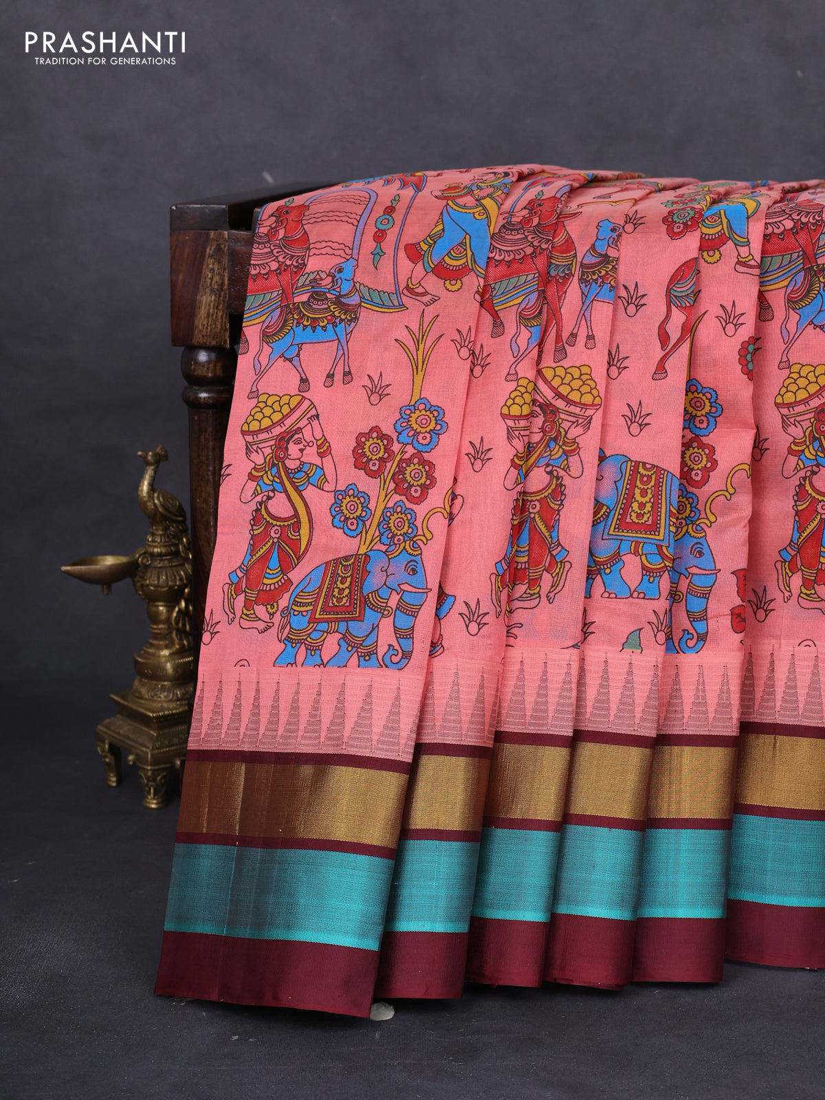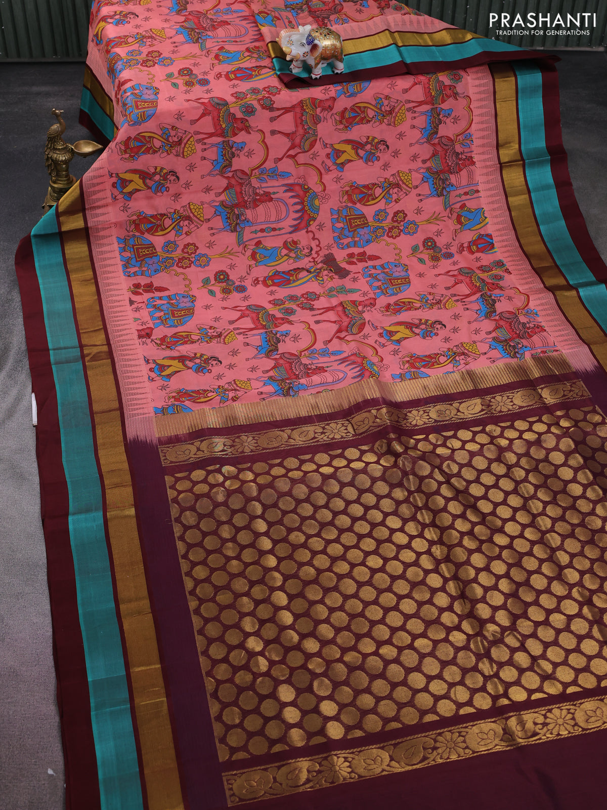 Silk cotton saree peach shade and deep maroon with allover floral prints and temple design zari woven simple border
