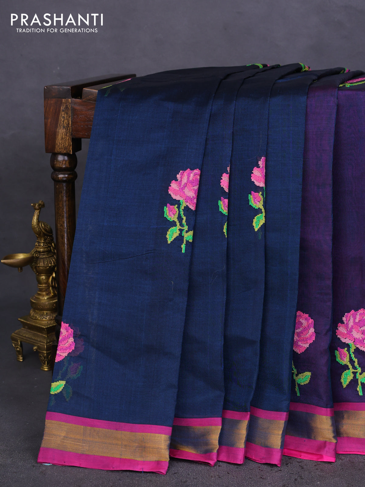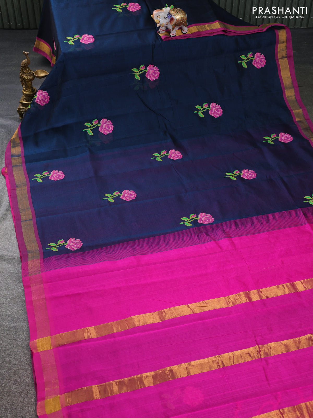 Silk cotton saree peacock blue and magenta pink with embroidery buttas and zari woven border