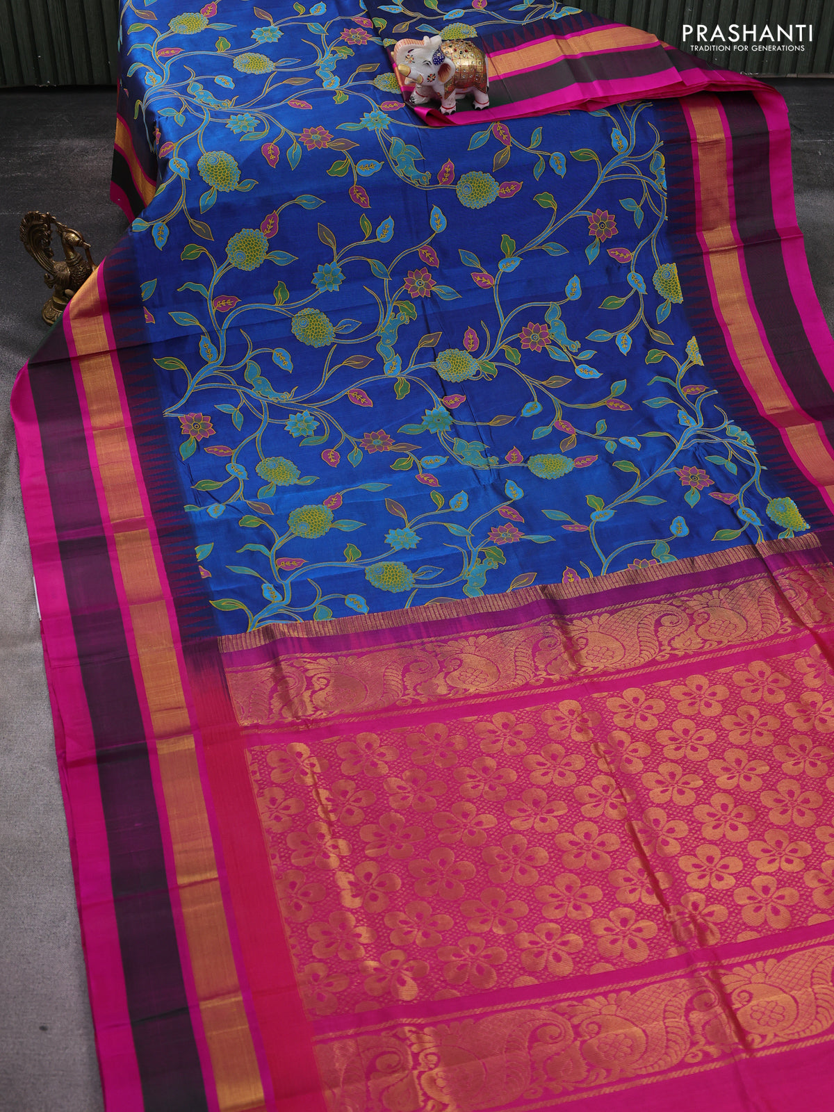 Silk cotton saree peacock blue and pink with allover kalamkari prints and temple design zari woven simple border