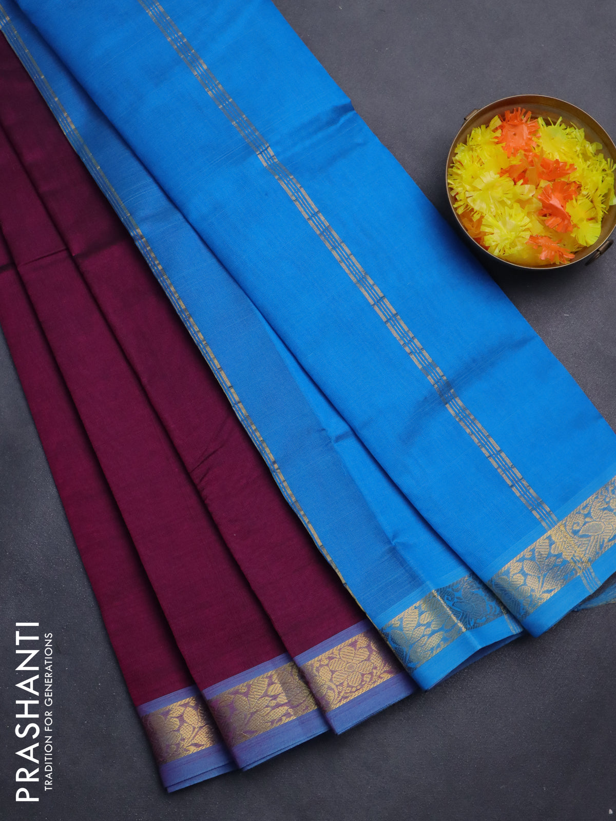 Silk cotton saree purple and cs blue with plain body and zari woven border